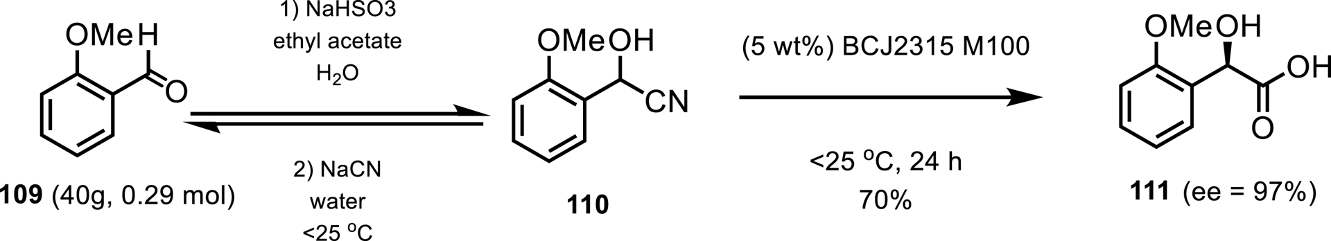 A nitrilase was also employed by Gilead and Almac for the enantioselective, dynamic kinetic resolution of (R)-2-methoxymandelic acid 111 [97]. A one-pot process was devised to exploit the reversible nature of the cyanohydrin formation step by performing a dynamic kinetic resolution with nitrilase BCJ2315 isolated from Burkholderia cenocepacia J2315. A multipronged approach was developed to improve the reaction performance and reduce enzyme deactivation by carrying out process development alongside in-silico-guided enzyme engineering. A scaled-up process at 10 g/L substrate loadings with the M100 mutant resulted in 70% isolated yield and 97% ee in 111 (Scheme 47).