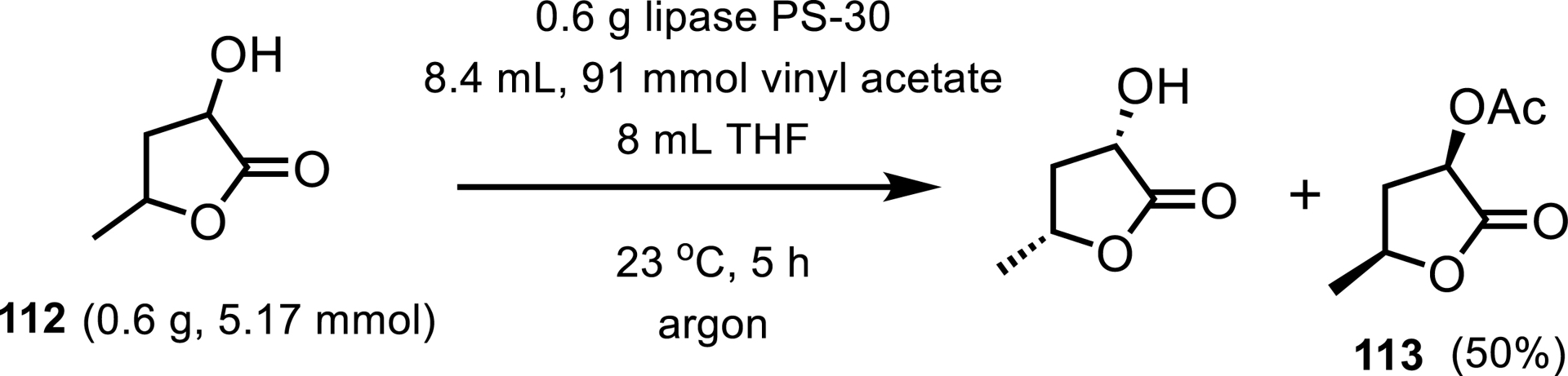 Ghosh and Nyalapatla presented a total synthesis of (+)-amphirionin-4 which exhibits proliferation-promoting activity in ST-2 cells [98]. This synthetic route includes a lipase resolution step to isolate an acetate intermediate 113 with readily available Burkholderia cepacia lipase (Amano PS-30). Using lipases in biocatalytic reactions is beneficial in this process since it requires a high solvent content. The resilience of this lipase to nonaqueous environments is demonstrated in the following example where approximately 50% of the reaction solution was THF (Scheme 48).