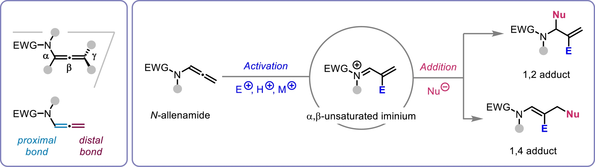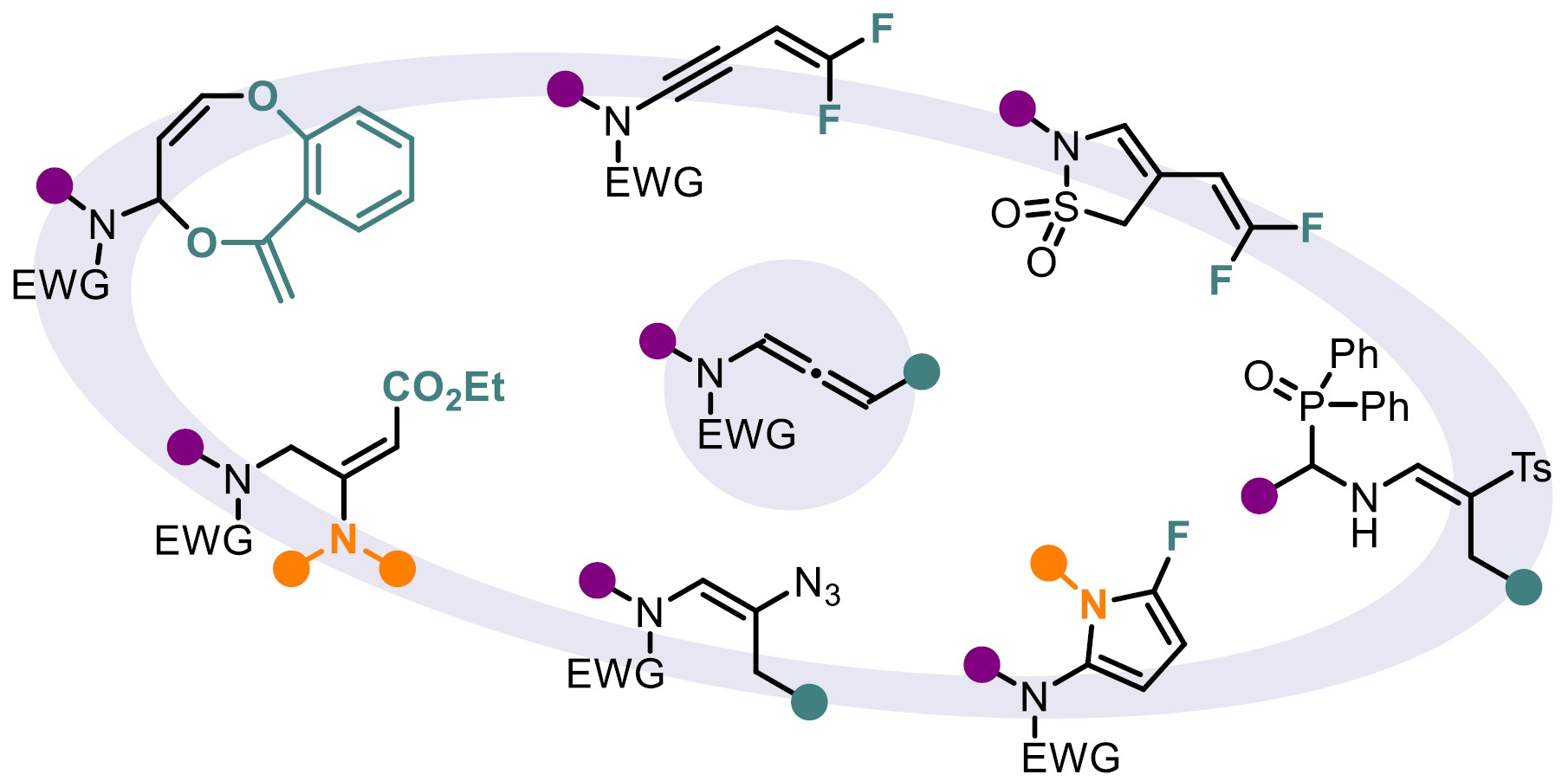 N-Allenamides, featuring an electron-withdrawing group (EWG) on the nitrogen atom, have gained significant attention among organic chemists over the past decade, surpassing their allenamine counterparts. This increased interest stems from their enhanced stability and retained distinctive reactivity. The delocalization of the nitrogen’s lone pair into the allenic system imparts these compounds with dual reactivity, as depicted in their resonance structures (Figure 1). As a consequence, a range of highly regio- and stereoselective functionalizations at the α-,β-, and γ-positions of the allene moiety has been developed. These transformations enable the construction of complex and valuable N-heterocycles, often yielding either proximal or distal adducts with precise control. The extensive focus that has been dedicated to N-allenamides is clearly reflected in the substantial number of publications and comprehensive reviews that have emerged over the years, highlighting their diverse and powerful reactivity as versatile synthetic building blocks (for selected reviews on N-allenamide, see [1, 2, 3, 4, 5]). Over the past three years, our research group has initiated a dedicated program focused on exploring the reactivity of activated N-allenamides. Our initial approach involved the use of ynamides as precursors to access these valuable intermediates. We then shifted our attention to investigating their reactivity, with particular emphasis on the construction of heterocyclic frameworks which are key structural motifs commonly found in natural products.
