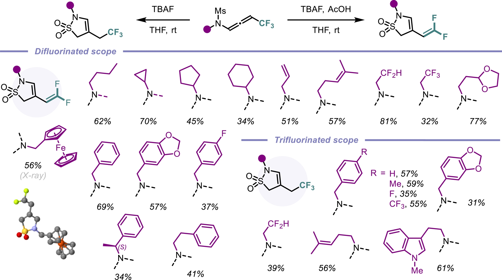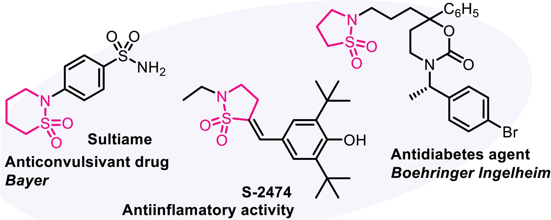 Since the discovery of sulfonamide antibacterials [45], sulfonamides have played a key role in medicinal chemistry. The cyclic counterparts of sulfonamide compounds (sultams) display enhanced biological activities compared to their acyclic congeners [46]. Our strategy aimed to exploit the electron-withdrawing substituent on the nitrogen atom in trifluorinated N-allenamides. Specifically, we hypothesized that deprotonation at the α-position of the sulfonyl group in N-sulfonyl allenamides could trigger an anionic 5-endo-dig cyclization, ultimately leading to the formation of cyclic sulfonamides. Although not found in nature, these amide surrogates are considered privileged motifs that have found diverse applications in drug discovery such as in sultiame, an anticonvulsant agent [47], S-2474, a non-steroidal anti-inflammatory drug [48], and an antidiabetes agent developed by Boehringer Ingelheim (Figure 4) [49]. Upon treatment with TBAF and acetic acid, CF3-substituted N-allenamides were transformed into γ-sultams bearing an ene-gem-difluorinated tether, whereas TBAF alone provided the corresponding trifluorinated ethyl sultams. The developed method demonstrated broad functional group tolerance and a wide substrate scope, affording sultams featuring a gem-difluorinated ene moiety (Scheme 10). Moreover, DFT calculations supported a reaction pathway involving a 5-endo-dig cyclization on the ene-ynamide intermediate generated in situ [50].