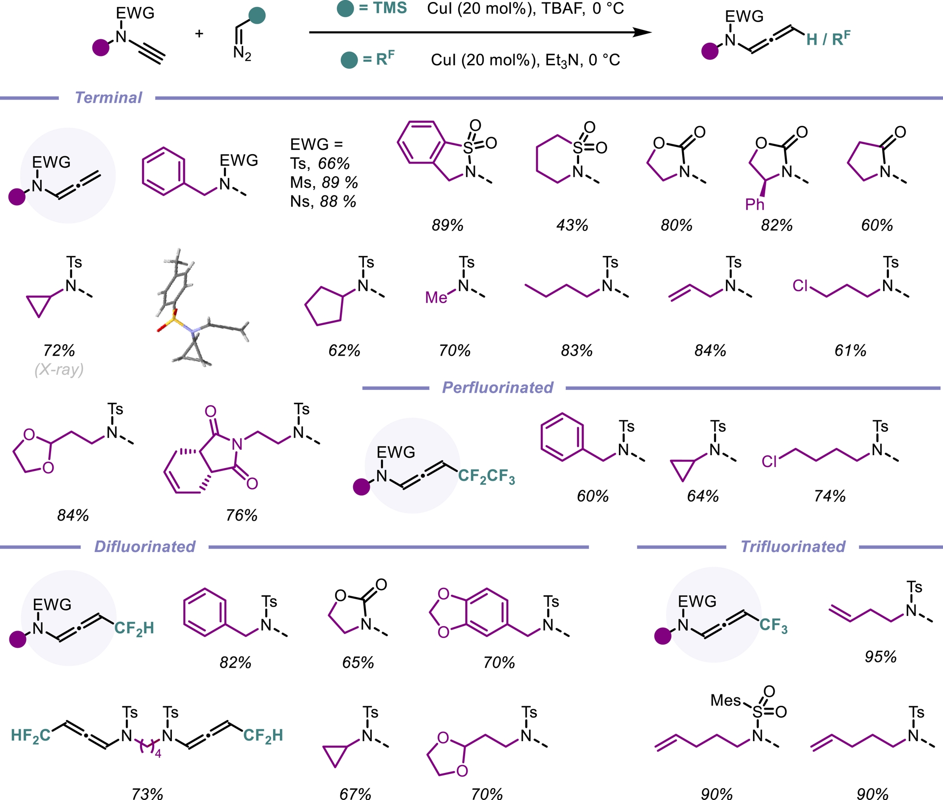 N-Allenamides, a subclass of allenes, have emerged as essential motifs in a myriad of transformations. Despite their growing prominence as unique and versatile building blocks in organic synthesis, existing methods for their preparation often suffer from limited substrate scope and restricted structural diversity. Inspired by the addition of diazo compounds to alkynes [6, 7, 8, 9, 10], we envisioned that a coupling reaction between terminal ynamides and a readily available diazomethane surrogate, trimethylsilyldiazomethane (Me3SiCHN2, 2 M in diethyl ether), in the presence of tetra-n-butylammonium fluoride (TBAF) could offer a straightforward route to terminal N-allenamides. We were pleased to find that the desired coupling products were obtained in good yields, and the reaction exhibited broad functional group tolerance, such as fluorinated substituents (Scheme 1) [11].