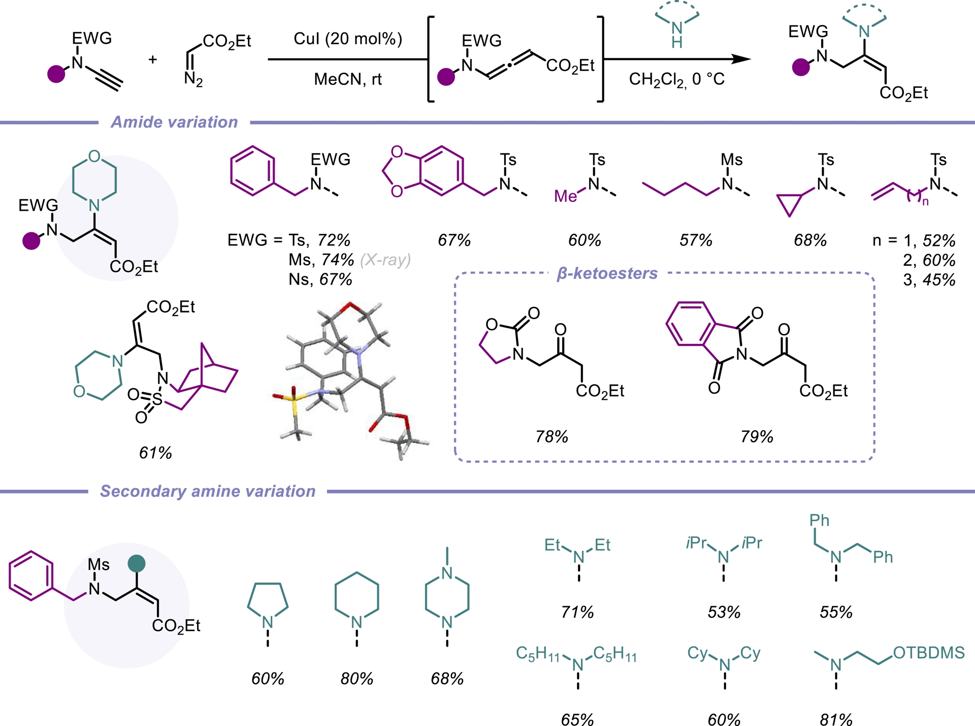 Building on our efficient access to a new class of push–pull allenes, we turned our attention to hydroaminations, an atom-economical reaction for constructing diverse heterocyclic scaffolds, which serve as valuable platforms for further functionalization. While significant progress has been made in hydroaminations targeting the proximal C=C bond [21, 22] and, to a lesser extent, the distal C=C bond [23, 24], additions to the central C=C bond remain comparatively rare. To address this gap, we employed our ynamide/diazo coupling method to synthesize N-allenamides bearing an ester substituent. Although these intermediates were highly unstable, they proved amenable to hydroamination, yielding a variety of amido-captodative enamines. Notably, the activated N-allenamides underwent regio- and stereoselective addition with a range of secondary amines. A counterintuitive anti-Michael addition provides a unique E-configured enamine. Numerous amides as well as distinct amines could be adapted (Scheme 2). Density functional theory (DFT) calculations further supported the regio- and stereoselectivity of the reaction [25].