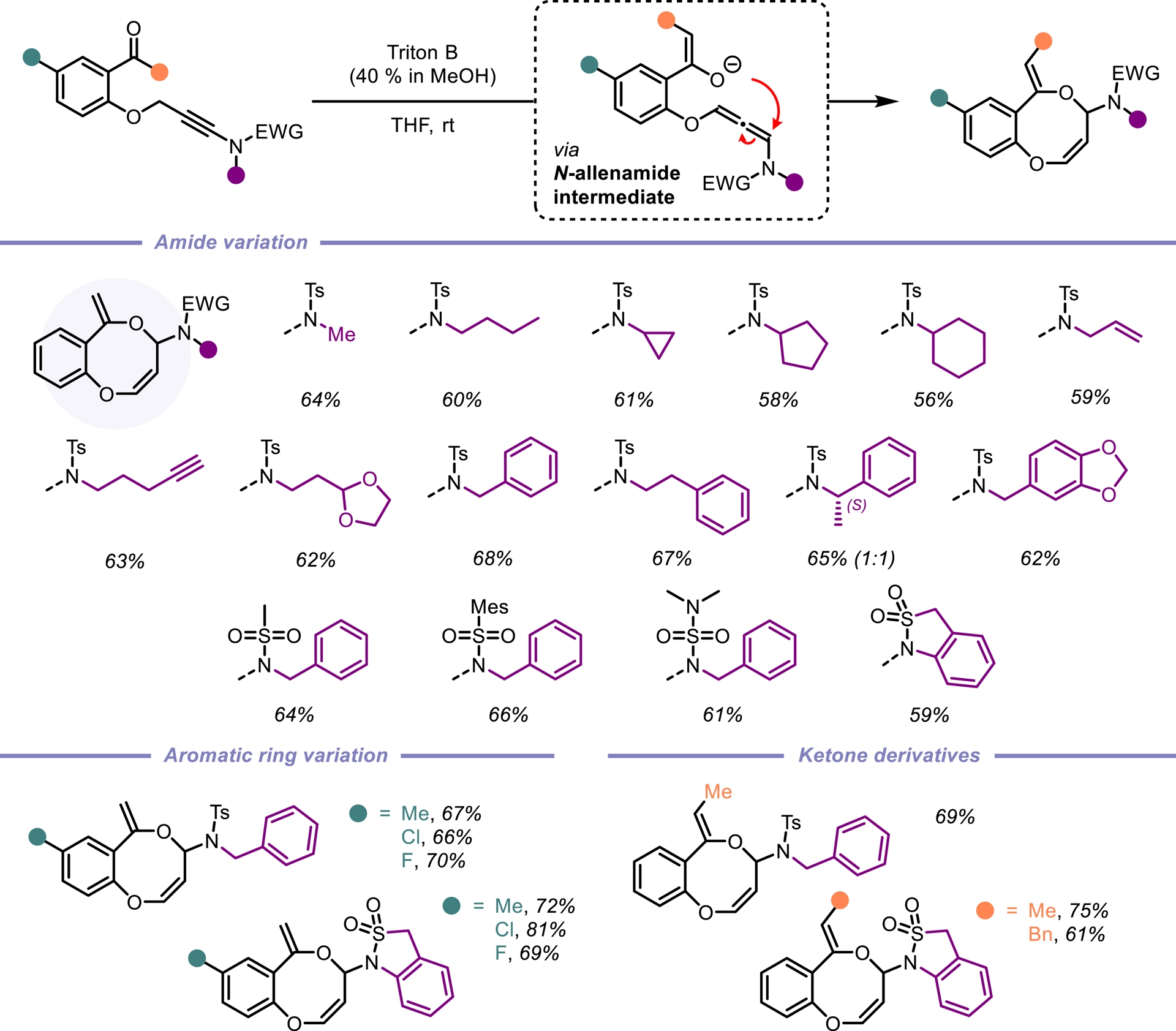 Eight-membered heterocycles are conspicuous structural motifs found in numerous natural products and/or bioactive molecules. However, their synthesis remains challenging due to unfavorable enthalpic and entropic barriers associated with the transition states required for medium-size ring formation [26, 27, 28]. Among these, benzo[b][1,5]-dioxocines stand out as particularly valuable eight-membered heterocycles. Notable examples include penicillide [29] and a derivative discovered by Bayer [30], both exhibiting significant biological activity. These compounds act as cholesteryl ester transfer protein (CETP) inhibitors and have emerged as promising candidates for the treatment of dyslipidemia (Figure 2) [31]. Reported Conia-ene reactions of ene-ynamides remain scarce [32, 33]. As part of our ongoing research on ynamide reactivity, we became interested in exploring the behavior of ynamides tethered to propargylic ethers under basic conditions [34]. Given that propargylic ethers are known to isomerize in the presence of a base, we hypothesized an enolate addition to the in-situ formed N-allenamide ether. Among the bases evaluated, a solution of benzyltrimethyl-ammonium hydroxide (Triton B) in methanol emerged as the optimal choice to perform this transformation. Experimental observations were supported by DFT calculations, indicating a regioselective O-alkylation, where the enolate adds to the proximal position of the N-allenamide. This transformation furnishes eight-membered rings featuring two embedded enols and a hemiaminal core. Importantly, the structure tolerates modifications at the terminal tether of the ynamide as well as both substituents on the nitrogen atom, demonstrating the versatility of this method in generating diverse, highly functionalized substructures. This approach offers a sustainable and green route to access shelf-stable eight-membered O-heterocycles, significantly expanding the accessible chemical space for this underexplored class of compounds (Scheme 3). The computed energy profiles show that the pathway involving the formation of an N-allenamide intermediate can be considered as the preferential one, essentially due to the lower activation energy and more favorable initial deprotonation step [35].