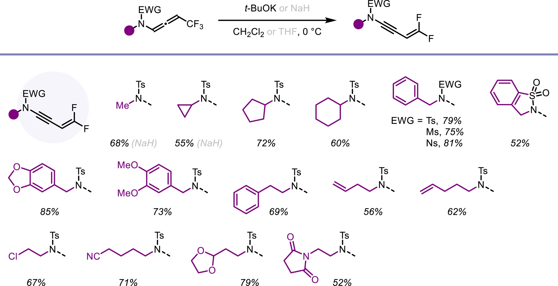 Fluorine-containing building blocks have become essential in the development of new drug candidates [12, 13, 14]. Despite major advances in fluorine chemistry, fluorine-substituted N-allenamides remain scarce [15]. Building on this, we sought to explore the synthesis of fluorinated N-allenamides using fluorinated diazoalkanes. Addition of trifluorodiazoethane to terminal ynamides under copper catalysis in acetonitrile led to the formation of the desired N-allenamides in very good yields. The pentafluoroethyl group, another highly fluorinated motif, also proved compatible with this transformation, cleanly delivering the corresponding N-allenamides. Encouraged by these results, we turned our attention to more challenging fluorinated substituents, notably the difluoromethyl group (CF2H). Recognized as a metabolically stable bioisostere of hydroxyl and thiol groups, the CF2H moiety has gained prominence in pharmaceutical, agrochemical, and materials science [16, 17]; for recent reviews on difluoromethylation reactions see [18, 19, 20]. When CF2HCHN2 was reacted with electron-deficient alkynes, we successfully obtained CF2H-substituted N-allenamides from terminal ynamides under similar conditions. Remarkably, the reaction displays broad functional group tolerance, accommodating oxazolidinones, halogens (e.g., chlorine), protected aldehydes, and even unsaturated side chains that offer further opportunities for downstream functionalization (Scheme 1).
