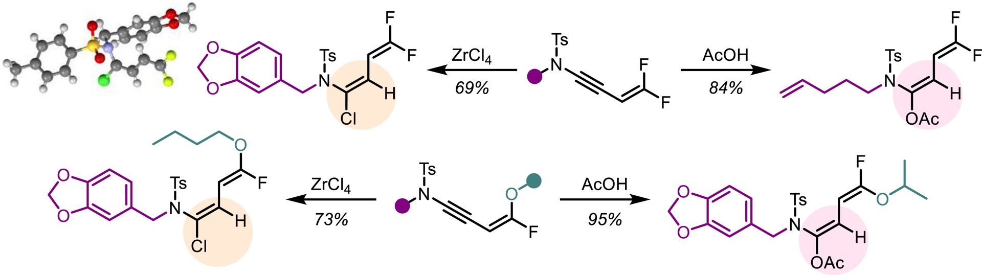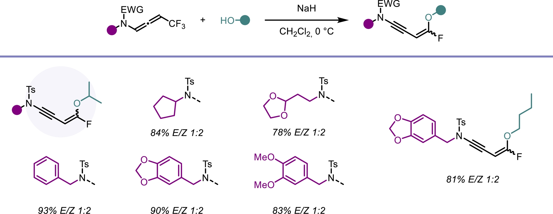 In light of our previous findings, we investigated whether trifluoromethylated N-allenamides could be leveraged to generate ene-ynamides with a particular emphasis on incorporating gem-difluoroalkene and monofluoroalkene motifs. These fluorinated alkenes are especially appealing: gem-difluoroalkenes act as carbonyl mimics, and monofluoroalkenes serve as bioisosteres of peptide and enol bonds [36]. For example, the pyrrolidone derivative seletracetam demonstrates a lack of psychomimetic effects, offering significant advantages over many conventional antiepileptic drugs [37]. In-vivo studies have shown that a difluoromethylated GABA aminotransferase inhibitor is highly effective in suppressing dopamine release following acute exposure to cocaine or nicotine [38]. The presence of a fluoroalkene transformed the opioid peptide Leu-enkephalin into an in-vivo probe with sufficient plasma and microsomal stability to provide an orally active peptide probe with central nervous system distribution (Figure 3) [39]. We found that a base-promoted δ-elimination of a fluorine atom from the CF3-substituted N-allenamides efficiently afforded gem-difluorinated ene-ynamides. Both potassium tert-butoxide (t-BuOK) and sodium hydride (NaH) proved to be effective bases for this transformation. The reaction proceeded smoothly and exhibited a broad functional group tolerance, accommodating a variety of functionalized side chains and electron-withdrawing groups, thus highlighting the versatility of this strategy (Scheme 4) [40]. Given the polarity of the ynamides and the high electrophilicity of the α-carbon of the gem-difluoroalkene moiety, it was possible to tune the reactivity of these peculiar building blocks by adding nucleophiles on the ynamide moiety or on the difluoroalkenyl part. Alcoholates were directly added to the starting N-allenamides. Interestingly, this reaction yielded a mixture of Z- and E-monofluorinated ene-ynamides, with the alkoxy group at the carbon atom δ to the nitrogen. The overall yield was good, and the two stereoisomers could be successfully separated, affording both Z- and E-configured ene-ynamides (Scheme 5). Subsequent selective syn-hydroacylation and hydro-chlorination promoted by ZrCl4 occurred exclusively at the ynamide moiety, enabling the synthesis of tailored mono- or difluorinated dienes depending on the starting material (Scheme 6) [40].