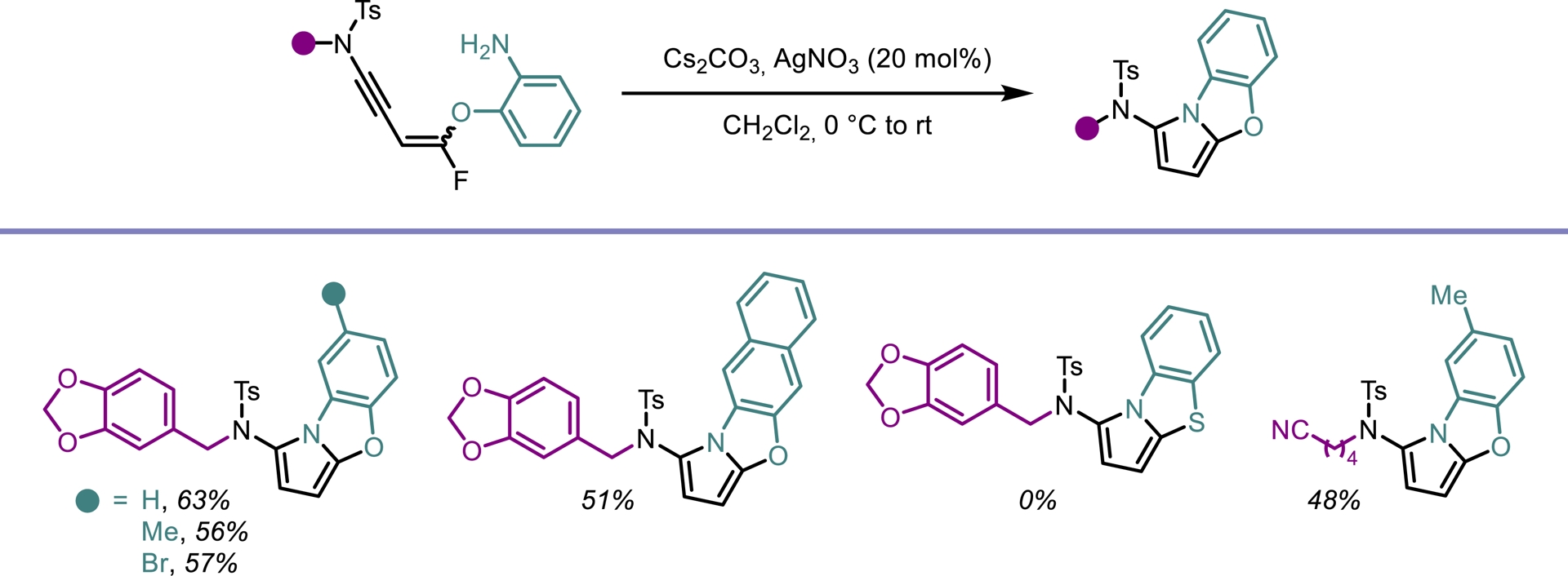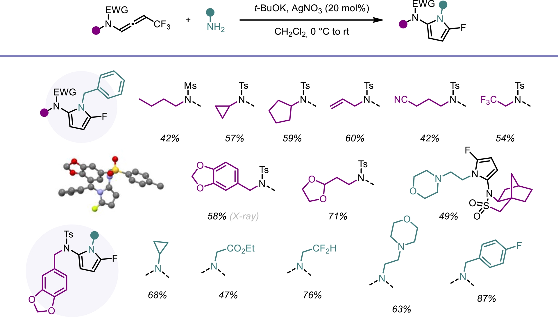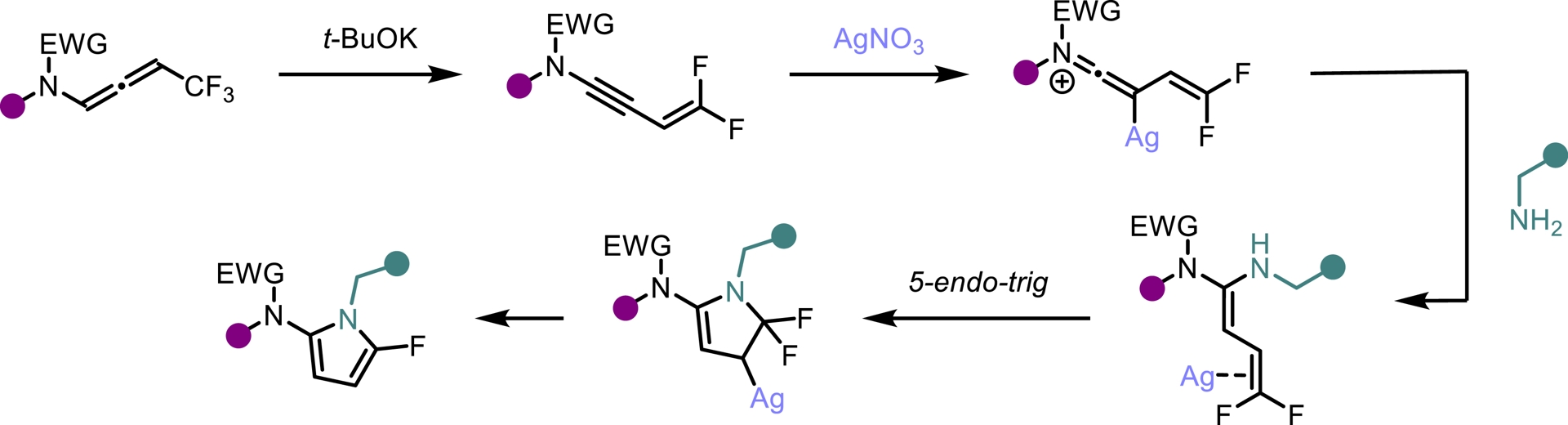 Despite their attractive properties, only a limited number of protocols have been developed for the synthesis of fluoropyrroles. Currently, fluorinated pyrroles are predominantly obtained through the functionalization of pre-existing pyrrole frameworks [41, 42, 43]. Building on our previous results, we envisioned that gem-difluorinated ene-ynamides [40] could serve as suitable precursors for the synthesis of fluorinated pyrroles via hydroamination followed by an intramolecular cyclization. To explore this possibility, we investigated the use of silver catalysts to promote the regioselective addition of primary amines to ene-ynamides. In contrast to alcoholates, primary amines selectively add to the ynamide moiety of the molecule generated in situ. Upon silver-mediated activation of the gem-difluoroalkenyl group, a 5-endo-trig cyclization followed by β-fluoride elimination occurred, furnishing the desired fluorinated pyrrole scaffold (Scheme 7). This transformation exhibits high modularity, allowing straightforward access to a wide range of highly functionalized 2-amido-5-fluoropyrroles. Good yields were obtained for this operationally simple process involving a one-pot four-step sequence (Scheme 8). An intramolecular version of this process led to the synthesis of tricyclic oxazoles from monofluorinated ene-ynamides embedding a primary amine (Scheme 9) [44].