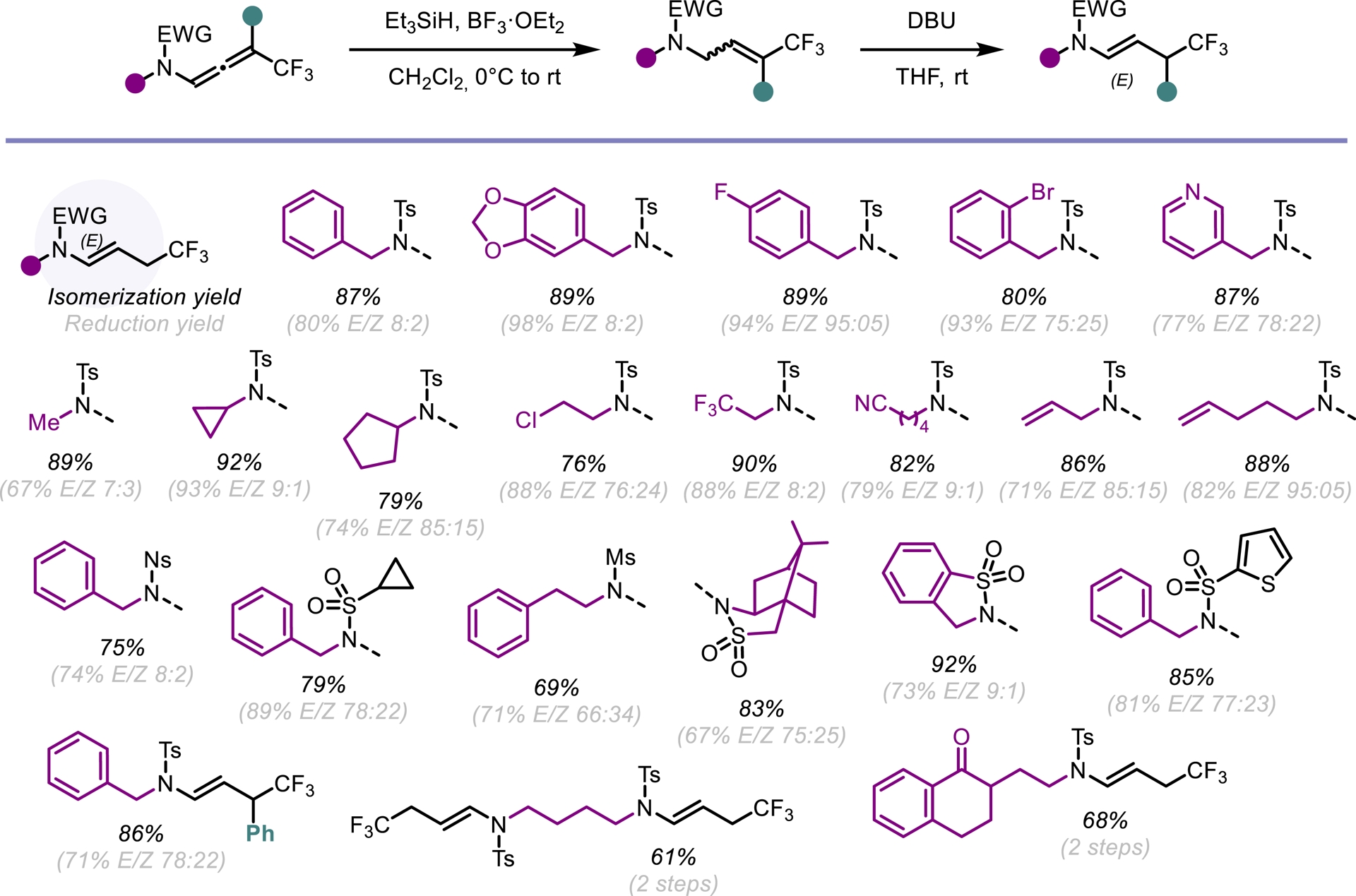 We next considered a chemoselective, metal-free approach for the 1,2- and 2,3-semireduction of CF3-substituted N-allenamides. The enamide moiety in these compounds was efficiently and regioselectively reduced using a combination of triethylsilane (Et3SiH) and boron trifluoride etherate (BF3⋅OEt2), affording the desired products with good stereoselectivity. Subsequent 1,8-diazabicyclo[5.4.0]undec-7-ene (DBU)-mediated isomerization of the resulting allyl amide proceeded cleanly, furnishing the E-configured enamide exclusively (Scheme 11) [51].