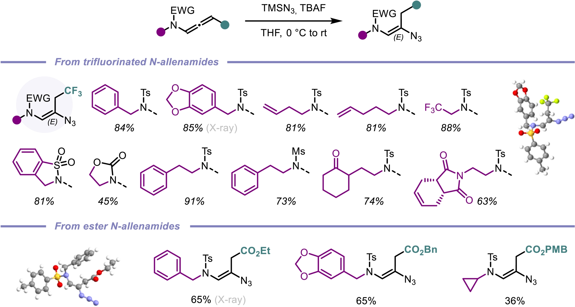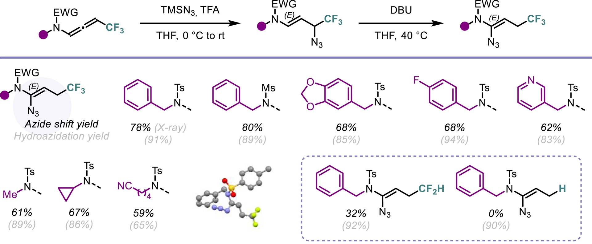 Among diverse organic azide compounds, vinyl azides represent a remarkable synthetic scaffold with their ability to act as an electrophile, an enamine-type nucleophile or a radical acceptor [52]. Given the unsaturated nature of N-allenamides, we envisioned that these compounds could be the perfect candidates to obtain vinyl azides via hydroazidations. We initiated our study by exploiting the reactivity of activated N-allenamides to achieve direct hydrofunctionalization at the central sp-hybridized carbon. Employing a combination of trimethylsilyl azide (TMSN3) and TBAF, we achieved a smooth hydroazidation of both trifluorinated and ester-substituted N-allenamides. This transformation yielded vinyl azides with complete regio- and stereoselectivity (Scheme 12). In contrast, when trifluorinated N-allenamides were activated with trifluoroacetic acid (TFA) in the presence of TMSN3, hydroazidation occurred selectively at the distal double bond. This enabled the site-specific installation of an azido group at the γ-position. While vinyl azides have found extensive utility in organic synthesis, allyl azides have often been overlooked due to their exposure to the Winstein rearrangement, typically leading to a mixture of isomers through allylic azide equilibrium [53]. In our system, the proximity of a heteroatom appears to suppress this equilibrium, enabling the exclusive formation of allyl azides featuring a conjugated system. Furthermore, treatment of these allyl azides with DBU induced a sigmatropic shift of the azido group, followed by double-bond isomerization. This process afforded vinyl azides with the azido moiety at the α-site with complete regio- and stereocontrol (Scheme 13) [54].