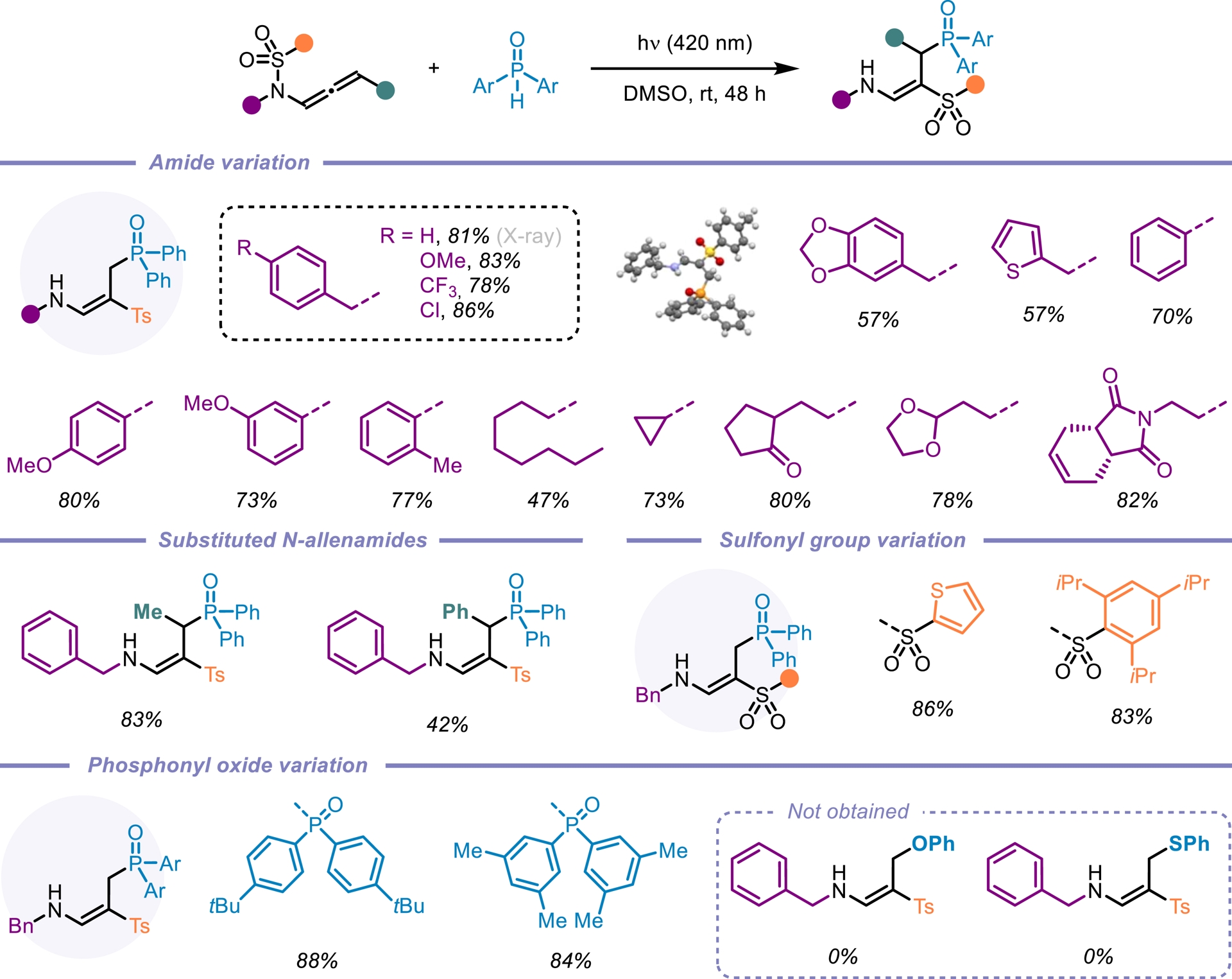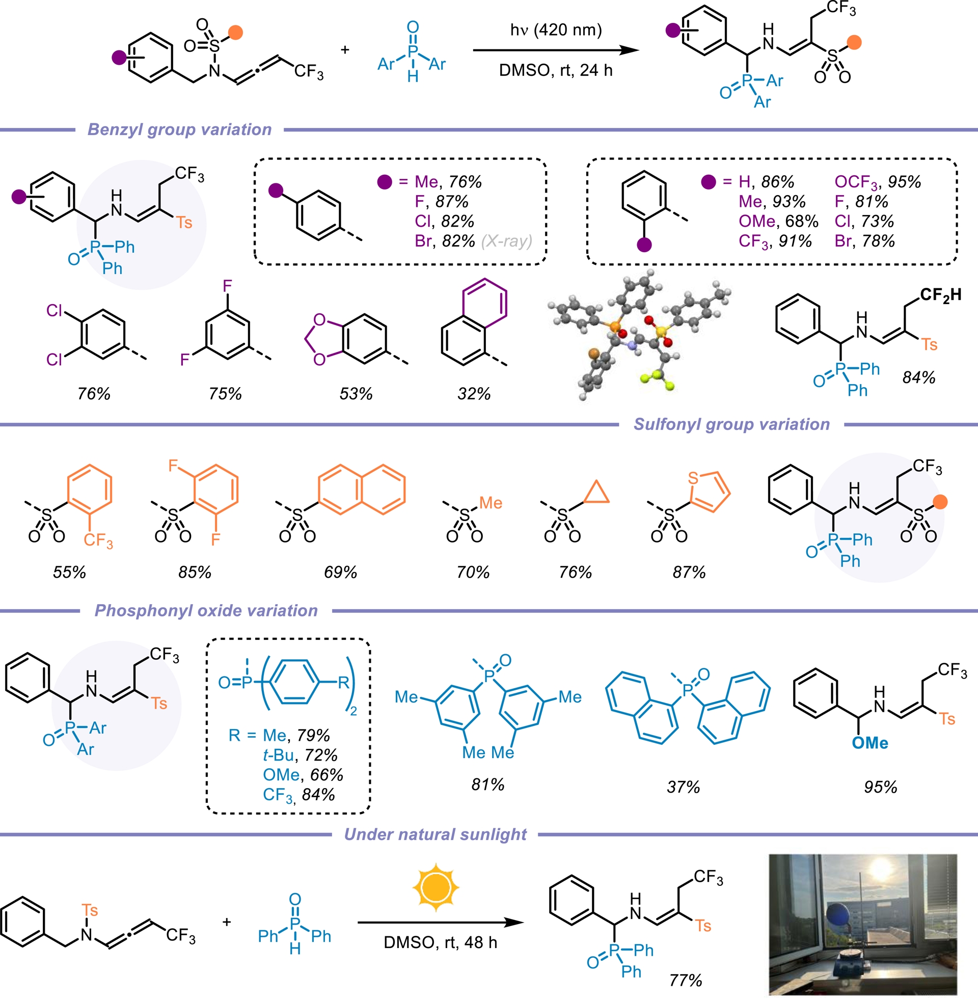 N-Allenamides bearing an electron-withdrawing group on the nitrogen atom have emerged as readily accessible and versatile nitrogen-containing synthons [1, 2, 3, 4, 5]. While their thermal reactivity—driven by electronic bias in the ground state (S0)—is well established [55, 56, 57], their behavior and reactivity in the triplet excited state (T1) remain largely unexplored. We were puzzled by the fact that the photochemical reactivity of N-sulfonyl allenamides remained unexplored (Figure 5) [58, 59]. We hypothesized that the presence of the sulfonyl group could be strategically leveraged to control the fate of the vinyl radical intermediate, potentially unlocking new reactivity pathways. Our investigations revealed that the direct addition of H-phosphine oxide to a CF3-substituted N-sulfonyl allenamide under visible-light irradiation led to the formation of the corresponding α-phosphorylated β-sulfonyl enamine. This transformation proved to be applicable to a broad range of substrates and demonstrated notable sustainability (Scheme 14). Remarkably, the reaction could be performed under natural sunlight over the course of two days, affording the desired phosphorylated enamine in 77% yield. Encouraged by our findings and the visible-light-induced N-to-C [1,3]-sulfonyl shift, we questioned whether this transposition could be extended beyond CF3-substituted N-allenamides. When terminal N-allenamides were employed in the presence of H-phosphine oxides, a divergent reactivity was observed, leading to the formation of structurally distinct hydrophosphorylated products. In this case, we propose that an intermolecular hydrogen atom transfer (HAT) occurs, followed by the addition of a phosphinoyl radical [P(O)⋅] to the terminal alkene moiety. This sequence furnishes γ-phosphorylated β-sulfonyl enamines. Notably, for terminal allenamides, functionalized side chains could be used and underwent a [1,3]-Ts shift, further expanding the structural diversity accessible through this approach. Additionally, terminal N-sulfonyl allenamides bearing various aryl and heteroaryl sulfonyl groups on the nitrogen atom were also effective substrates for this N-to-C [1,3]-sulfonyl shift reaction. This simple, efficient, and atom-economical process exhibits a broad substrate scope, excellent functional compatibility, and more importantly complete regio- and stereo-selectivity (Scheme 15) [60]. In conclusion, this account highlights our recent efforts toward the synthesis of activated N-allenamides and, more importantly, showcases their remarkable versatility as reactive intermediates. Under basic conditions, difluorinated ene-ynamides were efficiently generated. Nucleophilic additions to the difluorinated alkenyl moiety afforded highly functionalized, tailor-made dienes, while reactions with primary amines led to the formation of fluorinated pyrroles. Furthermore, the electron-withdrawing group on the nitrogen atom was strategically exploited to access potentially bioactive gem-difluorinated γ-sultams. Regio- and stereoselective reductions, as well as hydroazidations, delivered valuable fluorinated enamides, allylamides, and vinyl azides. Finally, the discovery of the first N-to-C tosyl shift in N-allenamides under photocatalyst-free conditions underscores the untapped potential of these compounds to unlock novel reactivity patterns and generate original phosphorylated structures.