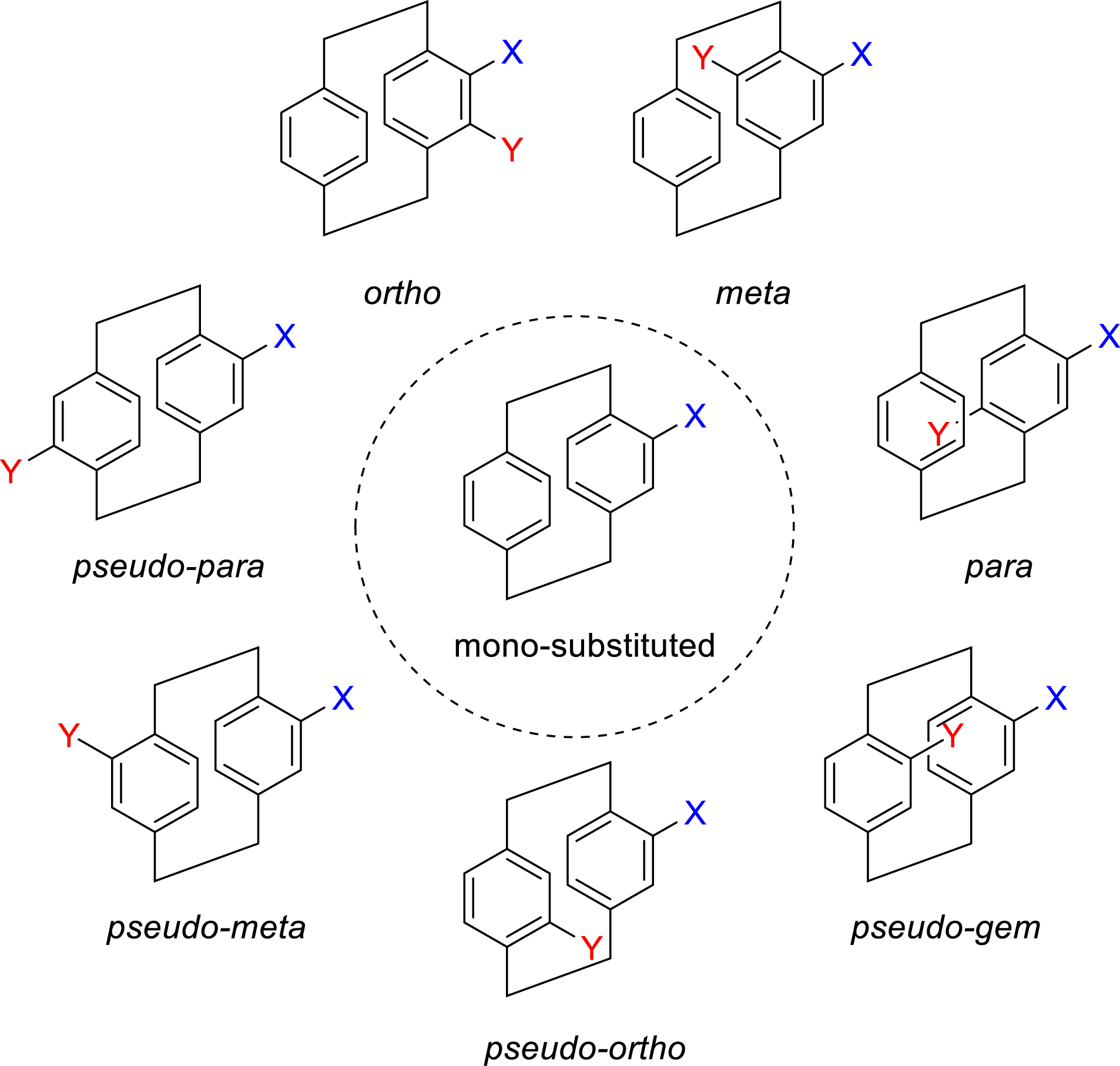 From monosubstituted intermediates, various disubstituted pCps can be easily prepared (Figure 2). These are typically classified according to their substitution pattern: ortho, meta, or para when both substituents are on the same aromatic ring; and pseudo-gem, pseudo-ortho, pseudo-meta, or pseudo-para when the substituents are located on both decks.