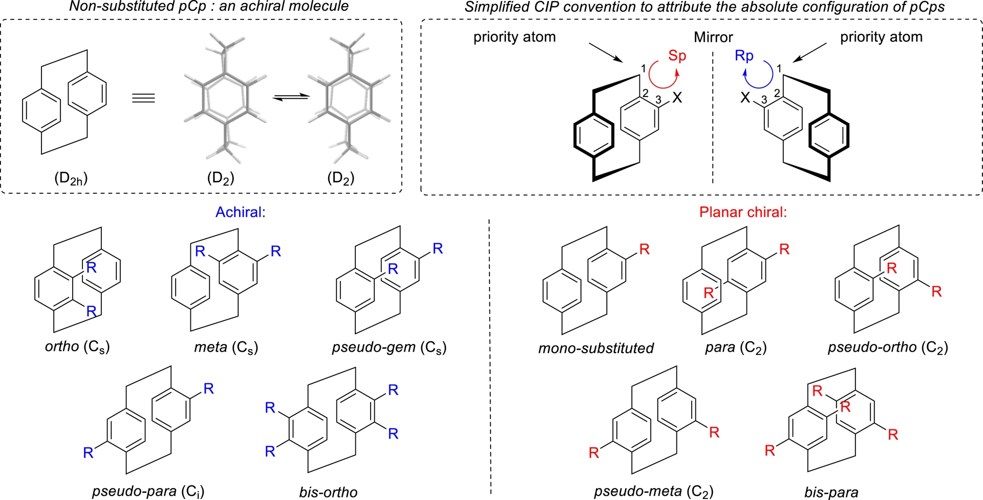Substituted pCps can exhibit planar chirality due to their rigid, strained structure, which prevents rotation of the aryl groups around their axes. Monosubstituted pCps are inherently nonsymmetrical, but disubstituted derivatives may or may not be chiral, depending on the nature and position of their substituents (Figure 3). Indeed, ortho, meta, pseudo-gem, and pseudo-para derivatives are achiral when both substituents are identical.