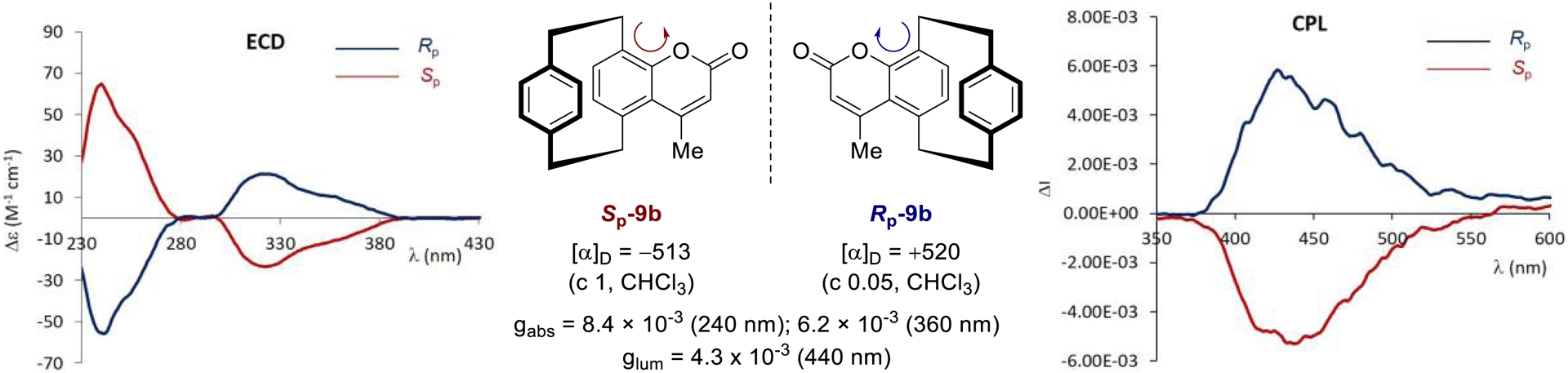 Chiroptical properties of pCp-based coumarins Sp-9b and Rp-9b. ECD and CPL spectra were recorded in CH2Cl2 (10−5 M, 𝜆ex = 320 nm).