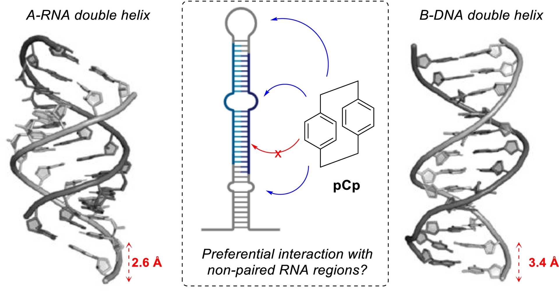 Inspired by these precedents, we hypothesized that pCps could preferentially drive recognition of non-helical RNA structural motifs. Indeed, their rigid and sterically demanding architecture, characterized by a 3.1 Å distance between the benzene moieties (Figure 1), does not match the helical rise per base pair in double-stranded RNA (2.6 Å) or DNA (3.4 Å), making intercalation unlikely and effectively limiting interactions with RNA or DNA duplexes (Figure 6).