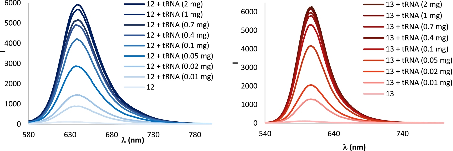Turn-on fluorescence responses of cyanines 12 (in blue) and 13 (in red) in the presence of increasing amounts of tRNA.