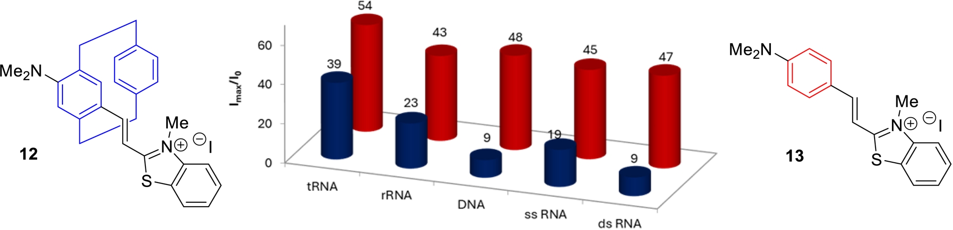 We next compared the behavior of the flat and three-dimensional cyanines in the presence of different types of nucleic acids. Interestingly, flat compound 13 exhibited comparable fluorescence turn-on responses with all tested nucleic acids (Figure 8, in red), indicating a non-selective interaction profile. In contrast, three-dimensional pCp-based derivative 12 displayed only modest fluorescence enhancements in the presence of double-stranded DNA or RNA (Figure 8, in blue), while it showed markedly stronger turn-on behaviors with nucleic acids containing multiple unpaired regions, with a clear preference for tRNA.