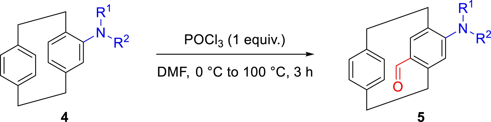 Despite significant progress, the selective introduction of multiple substituents onto a single aromatic ring of pCp remains a synthetic challenge. In our studies, we have developed an efficient and regioselective approach for synthesizing para-disubstituted pCps in a limited number of steps and with good overall yields. This strategy relies on a Vilsmeier–Haack formylation of various 4-amino[2.2]paracyclophane derivatives (4, Table 1), enabling the installation of a formyl group opposite to the existing electron-donating substituent.