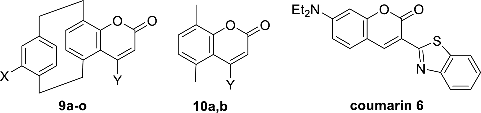 All pCp-based coumarins demonstrated notable photostability, along with exceptionally larger Stokes shifts (reaching up to 43 478 cm−1) in comparison with their flat analogues. However, these dyes generally exhibited modest fluorescence quantum yields (0.1% < Φ < 5%).