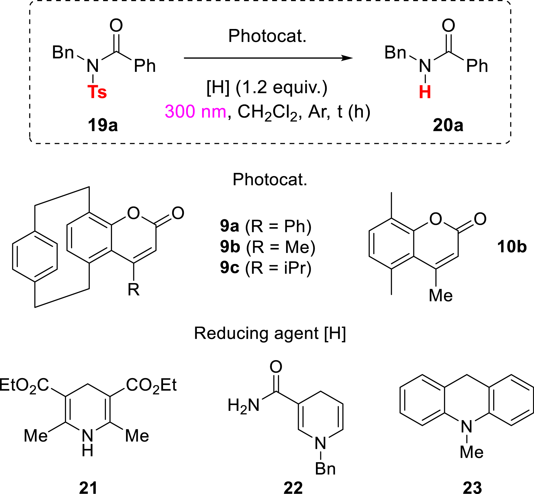 Starting from a readily accessible model substrate (19a, Table 5), prepared according to a reported procedure [78], coumarin derivative 9b demonstrated effective photocatalytic activity for the reductive cleavage of the tosyl protecting group. Using a Hantzsch ester as the sacrificial electron donor, irradiation at 300 nm led to 65% conversion within 2 h (Table 5, entry 1). Prolonging the reaction time did not improve this outcome (Table 5, entry 2); however, catalyst loading could be reduced from 20 to 5 mol% without any loss in efficiency (Table 5, entries 3 and 4). A series of structurally related pCp-based coumarins was evaluated to probe structure–activity relationships. Interestingly, catalyst 9a bearing aryl substituents proved significantly less effective (Table 5, entry 7), indicating that an alkyl group on the coumarin framework may be crucial for efficient photocatalysis in this case. Control experiments further confirmed the key roles of each component: no conversion was observed in the dark or in the absence of the Hantzsch ester (Table 5, entries 8 and 9), while reactions conducted without the pCp-coumarin—or with pCp-deprived analogue 10b—resulted in only traces of conversion (Table 5, entries 10 and 11). These findings underscore the unique contribution of the pCp moiety to the activity of the photocatalyst. The presence of oxygen significantly suppressed the deprotection (Table 5, entry 12), and no conversion was observed when TEMPO, a well-established radical scavenger, was added to the reaction mixture (Table 5, entry 13). Alternative reducing agents were evaluated as well but did not exhibit performances comparable to the Hantzsch ester (Table 5, entries 14–16).