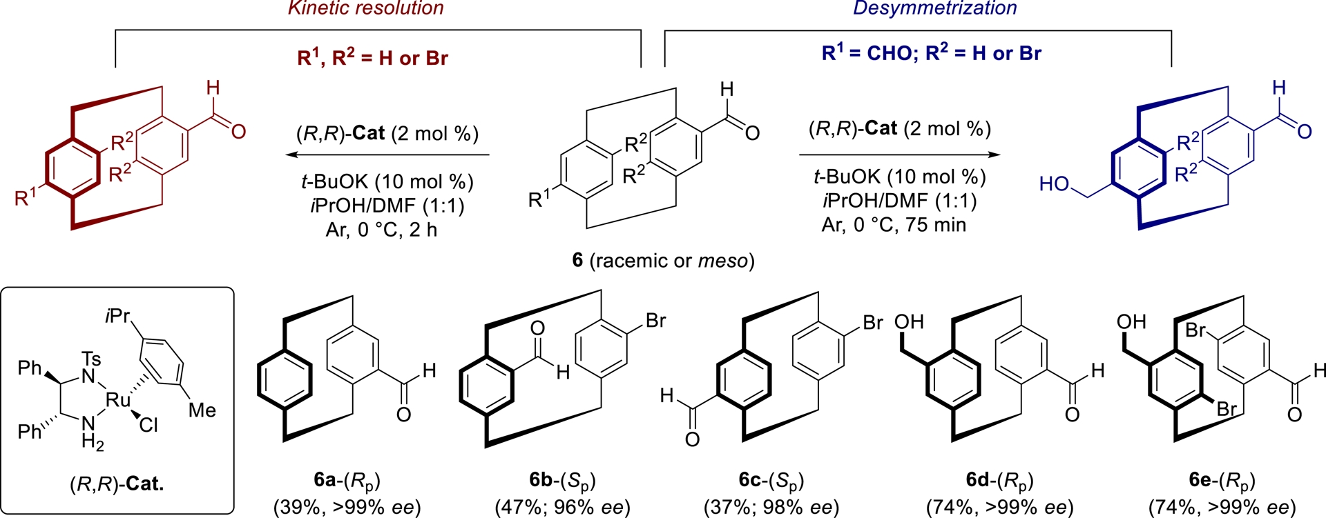 Starting from racemic aldehydes or centrosymmetric meso dialdehydes derived from pCp, we employed asymmetric transfer hydrogenations (ATH) as key transformations to control planar chirality [16, 32, 33]. After optimizing the reaction conditions, enantioselective reductions were successfully carried out using the commercially available Noyori’s catalyst RuCl(p-cymene)[(R,R)-TsDPEN] ((R,R)-Cat, 1 mol%) in a 1:1 iPrOH/DMF mixture at 0 °C, with t-BuOK (5 mol%) as the base. These reactions, which are operationally simple and easy to implement, delivered a wide range of optically active products in short times (Scheme 2).