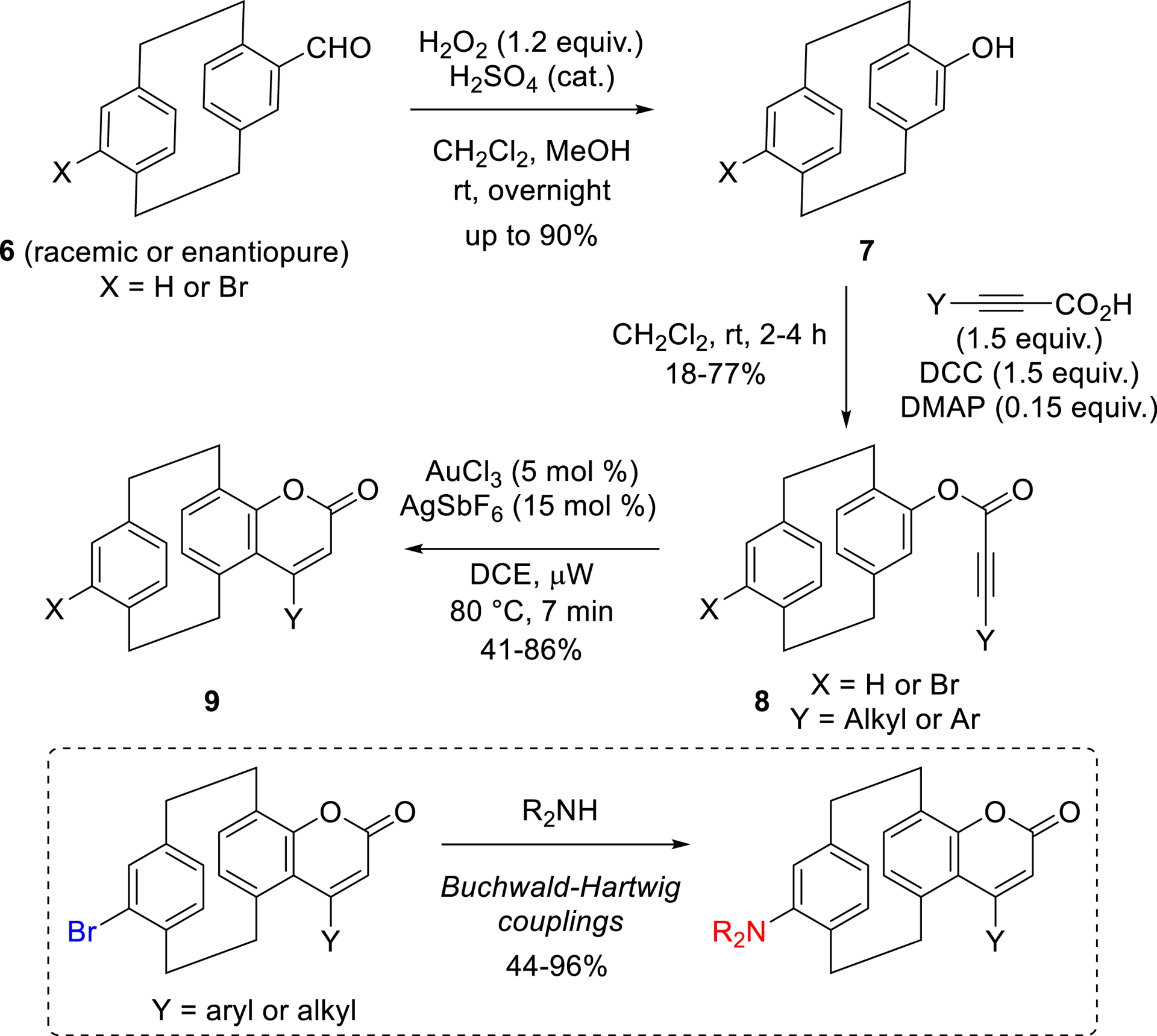 All the new families of 3D luminescent compounds that we developed [57] were synthesized in just a few steps, starting from aldehyde intermediates, the chirality of which can be easily controlled using the methods described earlier in this article. For example, three-dimensional coumarin dyes were synthesized in three steps, beginning with Dakin oxidation, conducted using H2O2 and catalytic amount of H2SO4 in a CH2Cl2/MeOH mixture, to form 4-hydroxy[2.2]paracyclophanes 7 in up to 90% yield. These molecules were then esterified with various propiolic acid derivatives under classical conditions (DCC and DMAP cat. in CH2Cl2). The resulting esters 8 were subjected to cyclization promoted by gold- and silver-based catalysts in 1,2-dichloroethane under microwave irradiation at 80 °C, yielding the desired coumarin core 9 (Scheme 3). In a final diversification step, starting from brominated compounds, Buchwald–Hartwig couplings were employed to introduce electron-donating amino groups on the pCp scaffold [58].