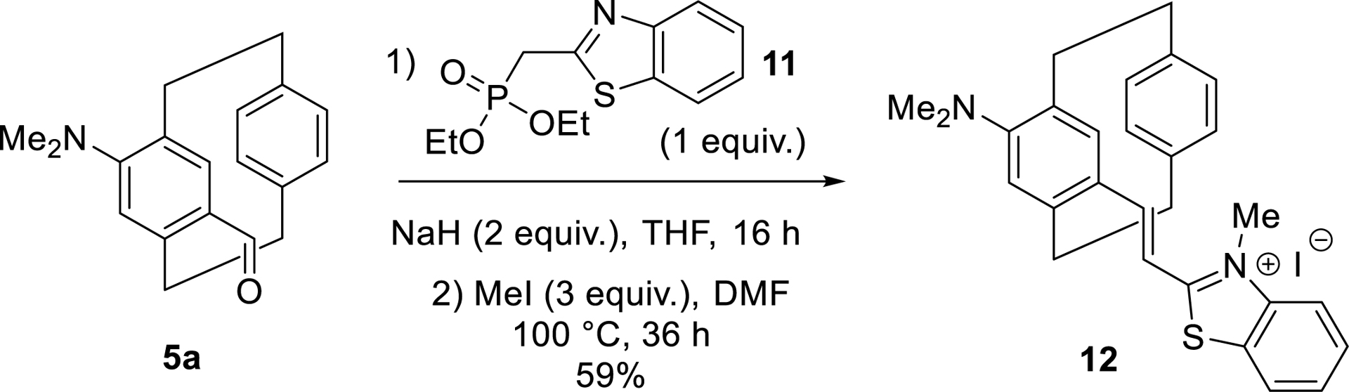 Three-dimensional cyanine-type dyes based on the pCp scaffold were also readily prepared from aldehyde intermediates, particularly those obtained via the regioselective formylation strategy outlined in Table 1. In this case, key aldehyde 5a, bearing a dimethylamino group, underwent a Wittig-type reaction with compound 11, followed by N-methylation of its benzothiazole moiety. This sequence efficiently led to the formation of novel luminescent compound 12, which exhibited emission in the red region of the electromagnetic spectrum (Scheme 4). Once again, both racemic and enantiopure products could be synthesized using the strategies developed in our laboratory [59].