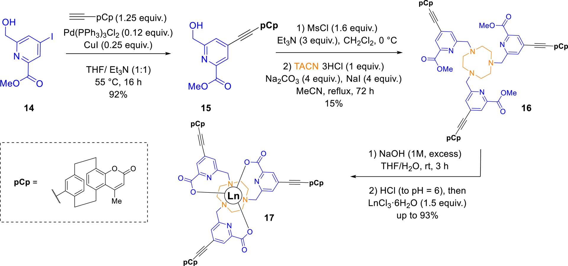 As part of this study, in collaboration with Dr. O. Maury’s group (ENS Lyon), we successfully prepared a series of picolinate-based lanthanide complexes bearing pCp-derived coumarin antennas (Scheme 5) [69]. The synthesis of these molecular objects began with compound 15, obtained from a 3D coumarin bearing a triple bond at its pseudo-para position, via a Sonogashira cross-coupling with iodo-picolinic ester 14. Following mesylation, the intermediate was coupled to 1,4,7-triazacyclononane (TACN), yielding target ligand 16 in 15% overall yield after purification by column chromatography. Complexation with lanthanide ions was then carried out via in-situ saponification, followed by the addition of the hydrated lanthanide chloride at pH 6 (Scheme 5).
