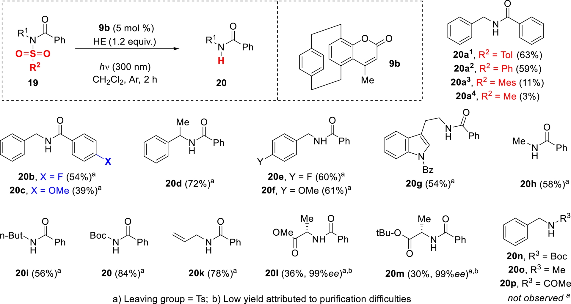 The scope of the reaction was subsequently examined using the conditions optimized on substrate 19a, as illustrated in Scheme 6. The deprotection of a range of sulfonyl groups, including tosyl (Ts), phenylsulfonyl (SO2Ph), and mesitylsulfonyl (SO2Mes), was tested using 5 mol% of catalyst 9b. In line with the reactivity observed for the Ts group, efficient removal of the phenylsulfonyl moiety afforded compound 20a3 in 59% yield. Conversely, sulfonamides bearing mesityl or mesyl groups proved unreactive under identical conditions, yielding only trace amounts of the desired product.