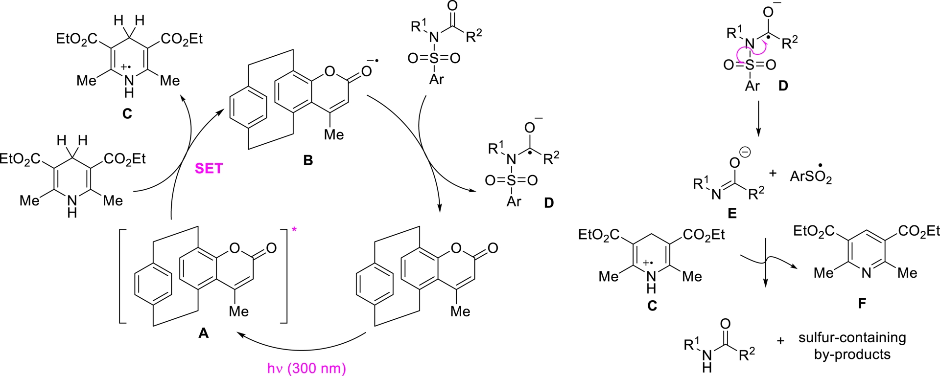 Upon irradiation at 300 nm, pCp-based catalyst 9b is promoted to its excited state (A), which then undergoes a single-electron transfer (SET) with the Hantzsch ester. This step generates dihydropyridine radical cation C and coumarin-centered radical anion B. The radical anion subsequently interacts with the reaction substrate, forming radical intermediate D and regenerating the ground-state photocatalyst. Note that the formation of intermediate D aligns with analogous species previously identified in related electrochemical processes [82]. Radical D then undergoes homolytic cleavage of its N–S bond, yielding carboxamide anion E and aryl sulfonyl radical $\mathrm{ArSO}_{2}^{\bullet }$. The final desulfonylated product is formed through quenching reactions between these species and dihydropyridine radical cation C. The proposed mechanistic pathway was further corroborated by theoretical calculations carried out in collaboration with A. Maruani (LCBPT UPCité).