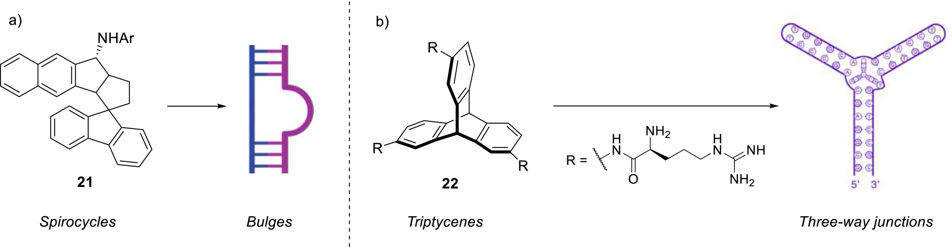 Similarly, triptycene-based ligands have been reported to specifically target three-way junctions (Scheme 8b) [98, 99, 100]. Notably, these last compounds exhibited potential as modulators of the heat shock response in E. coli, highlighting their functional relevance as RNA-targeting agents. The non-planar architecture of these molecules, which arranges aromatic groups across orthogonal planes, appears to mitigate non-specific intercalation into double-helical regions. This spatial configuration enhances selectivity for non-duplex RNA motifs while minimizing off-target interactions with double-stranded DNA, thus overcoming a common limitation of planar aromatic RNA-binding compounds.