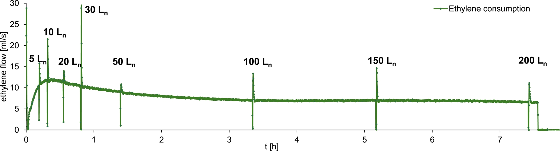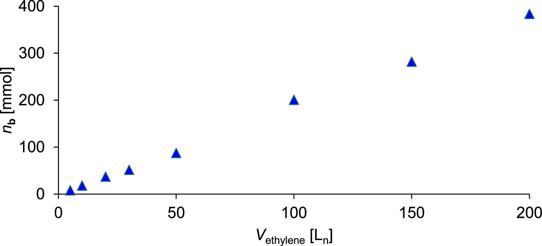 The methodology applied for the synthesis of 4-ethyl-1-decene b (Figure 9) is analogous to that used for the preparation of a. The corresponding reaction parameters are summarized in Table 3. The amount and mass of b obtained after a defined ethylene consumption are listed in Table 4. Figure 10 displays the plot of the synthesized amount of b versus the corresponding ethylene consumption.