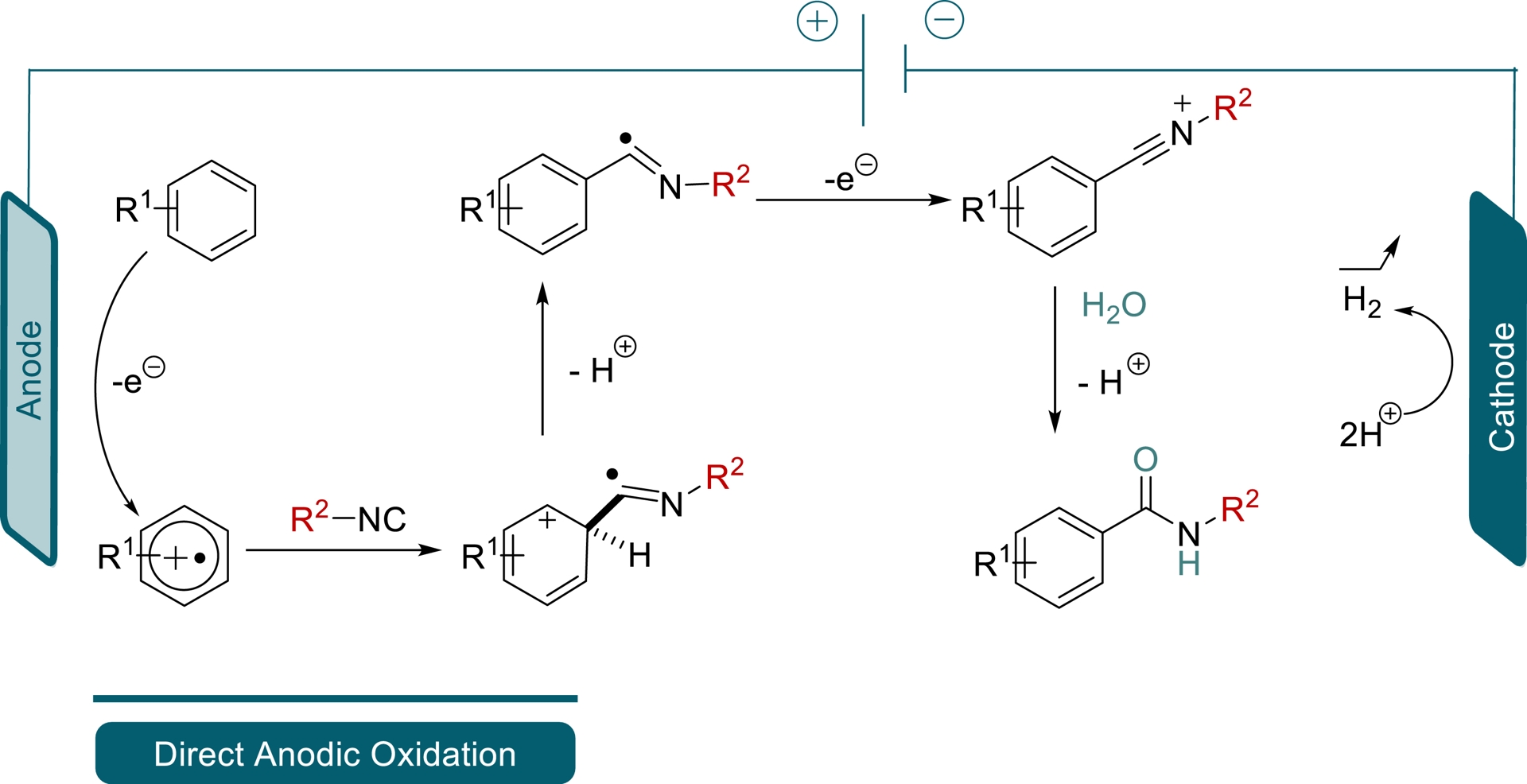 Indeed, building on the mechanistic studies of Gooßen et al. [13], we surmised that a radical cation, produced at the anode from the direct oxidation of an arene, could be trapped by an isocyanide and a water molecule to build arylcarboxamides. The released protons would in turn be converted into dihydrogen at the cathode, closing the electrical circuit (Scheme 2). This original carboxamide synthesis would avoid the use of catalyst and stoichiometric oxidants, using green energy (94% of low-carbon electricity in France’s electricity mix in 2024, 96% in 2025) to convert available substrates into high-value products [16].