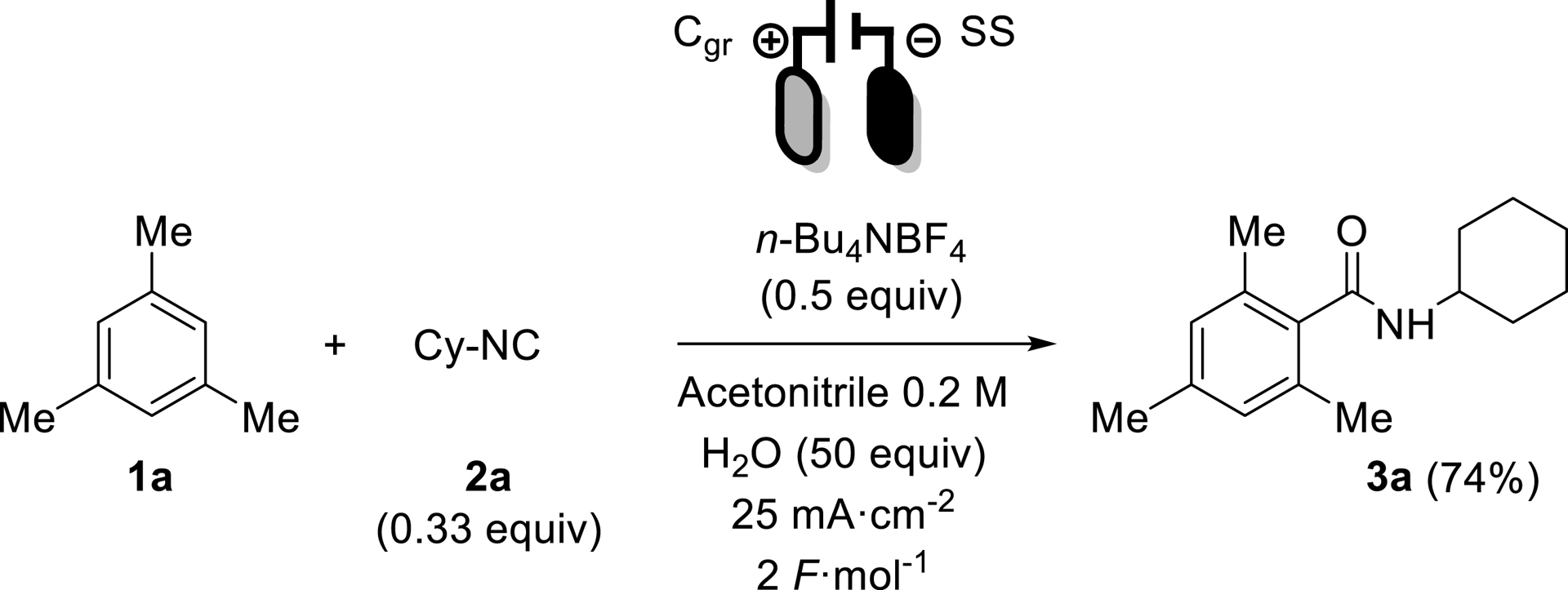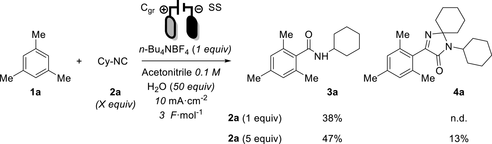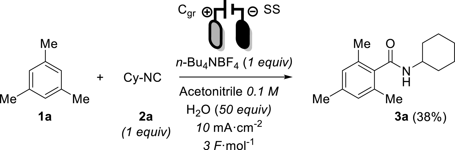 With this strategy in mind and using our in-house expertise on electro-induced IMCRs, we selected mesitylene 1a as a prototypical oxidizable arene along with cyclohexyl isocyanide (Cy-CN) 2a as partner in acetonitrile as solvent. A quick pre-optimization led to choose N-tetrabutylammonium tetrafluoroborate (n-Bu4NBF4) as supporting electrolyte, graphite as cathode and stainless steel as anode. These conditions led to the isolation of desired product 3a in 38% yield, which constituted the starting point of the optimization process.
