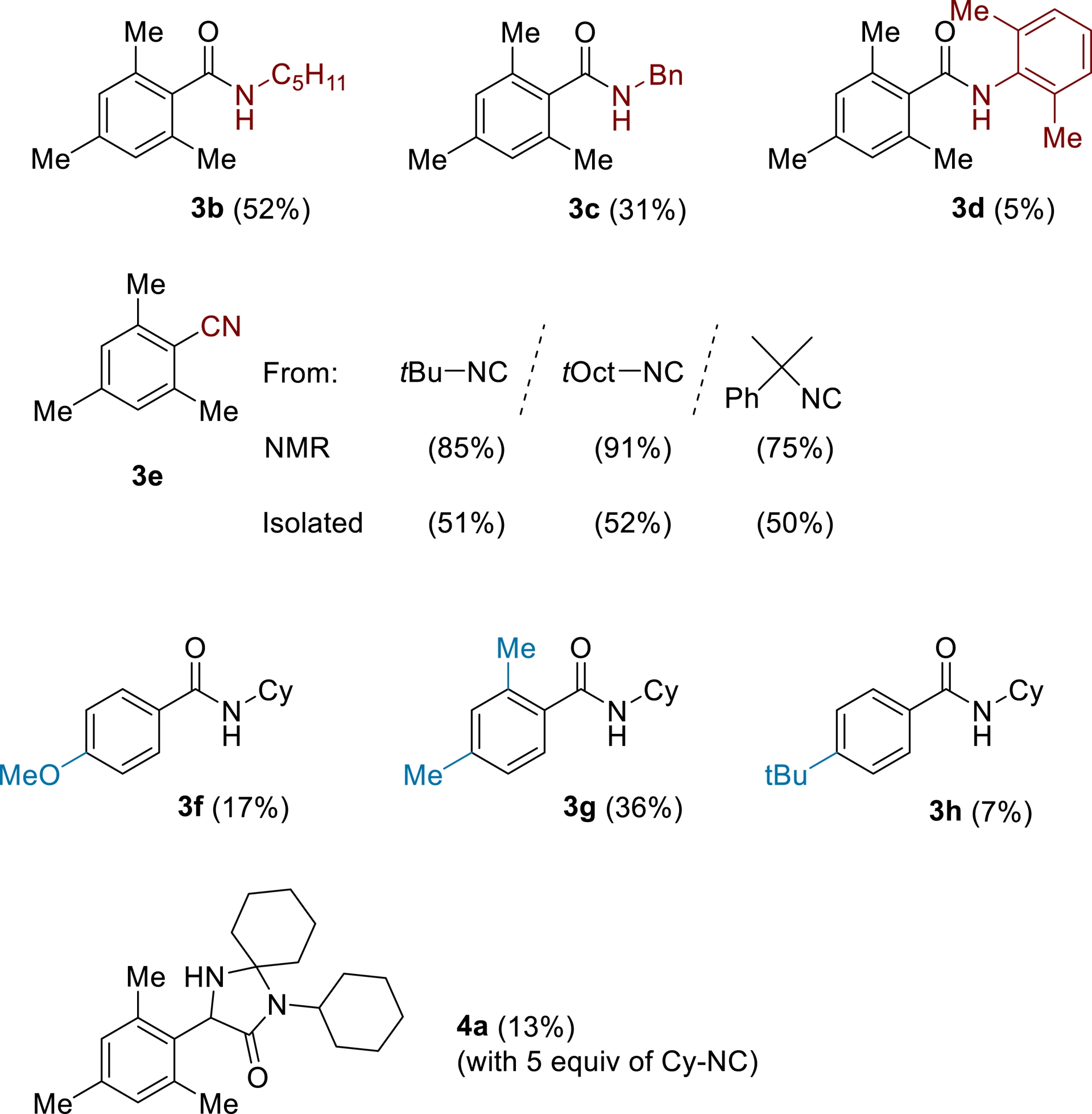 In our case, maximizing the yield was the main goal, which would be measured by 1H NMR against an internal standard, the supporting electrolyte (it was proven to be stable with external standards). The research space was designed as neutral as possible, to avoid introducing human bias into the model (see Table 1). As an example, various amounts of the isocyanide led to different products, 3a and 4a (see Scheme 4, structure of 4a was elucidated by X-ray analyses). Thus, the number of isocyanide equiv had to be limited between 0.33′′ and 3 (0.33 experimentally means 1 equiv of isocyanide and 3 equiv of mesitylene).