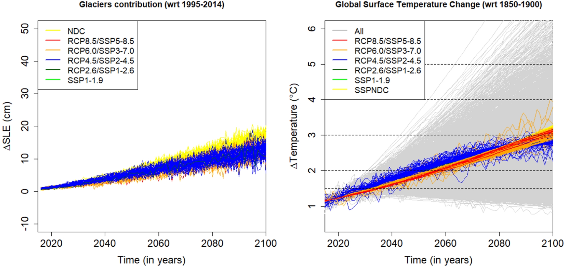 Subset of emulated glacier melting projections meeting the French climate projection assumptions. The right panel displays the projected temperature of emulated model projections meeting these assumptions. The left panel shows the resulting contribution of glaciers to sea-level rise to 2100. Note that simulations meeting the constraints are not limited to RCP4.5 or SSP2-4.5 scenarios, because some climate models have lower climate sensitivity and only reach 3 °C by 2100 despite higher greenhouse gas emissions.