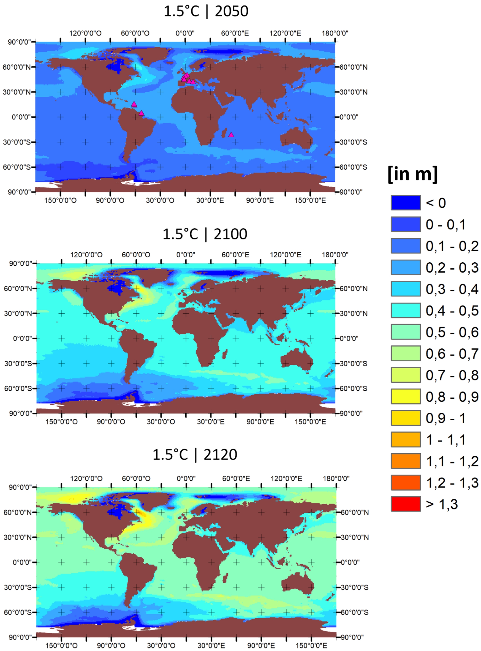 Median regional sea-level projections for a stabilization of climate at 1.5 °C GWL. Projections are given in meters with respect to the reference period 1995–2014. Pink triangles indicate the location of sites given in Supplementary Material 3. These projections follow the French climate scenario that is indicatively given to remind the climate mitigation objective of the Paris agreement (see Section 2.1).