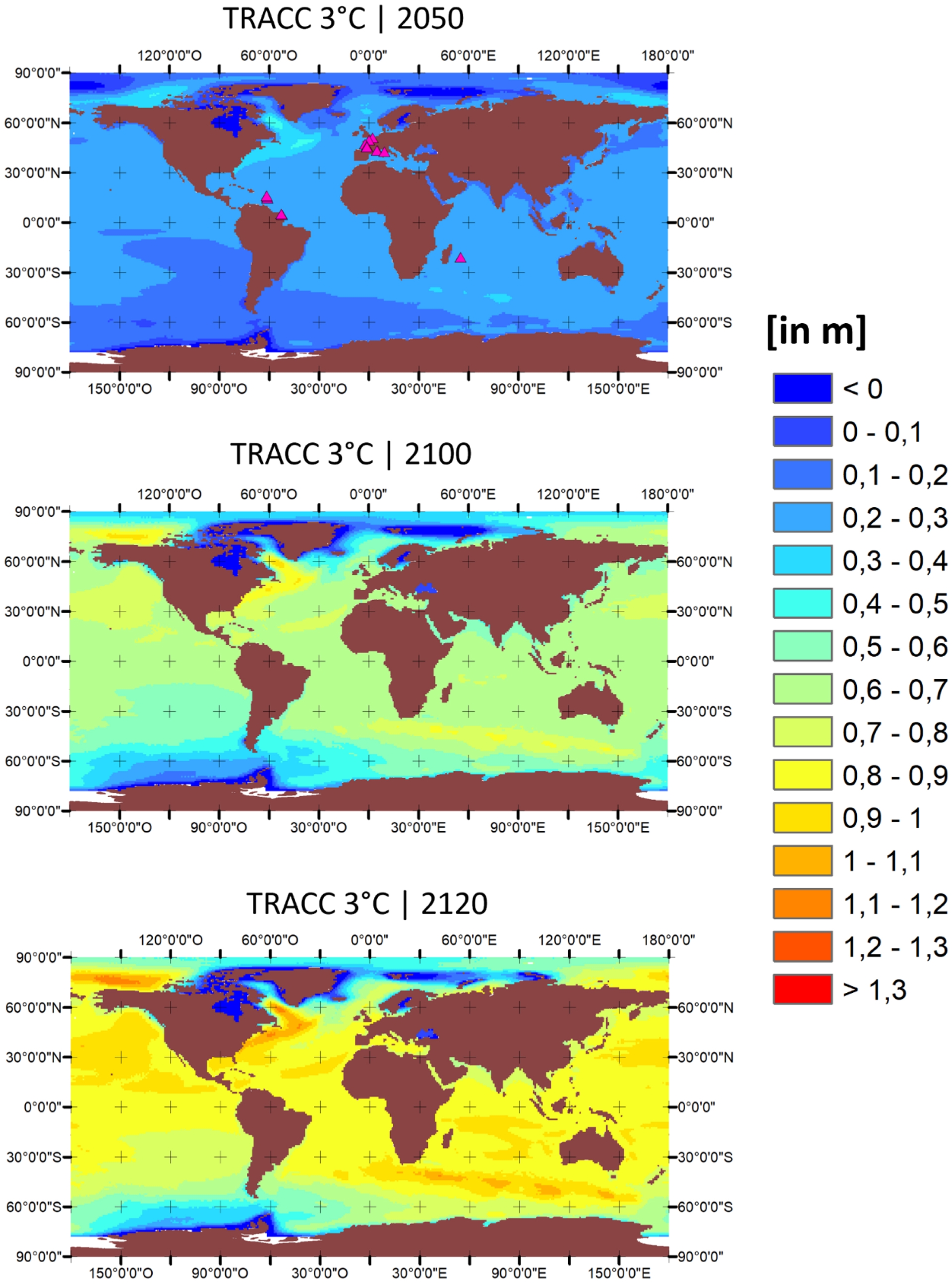 Median regional sea-level projections for climate change scenario reaching 3 °C GWL in 2100 as assumed in the French Climate Scenario (TRACC). Projections are given in meters with respect to the reference period 1995–2014. Pink triangles indicate the location of sites given in Supplementary Material 3.