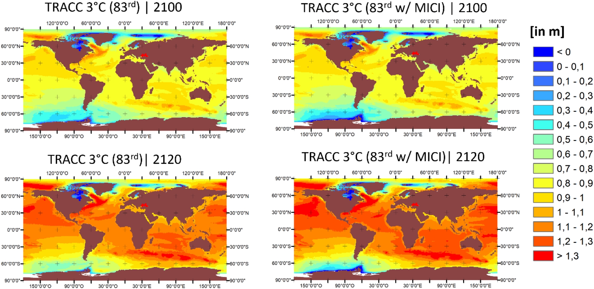 Regional sea-level projections in 2050, 2100 and 2120 (in meters) corresponding to the 83rd percentile of the 3 °C GWL level scenario with respect to 1995–2014 with MICI (left) and without MICI (right).