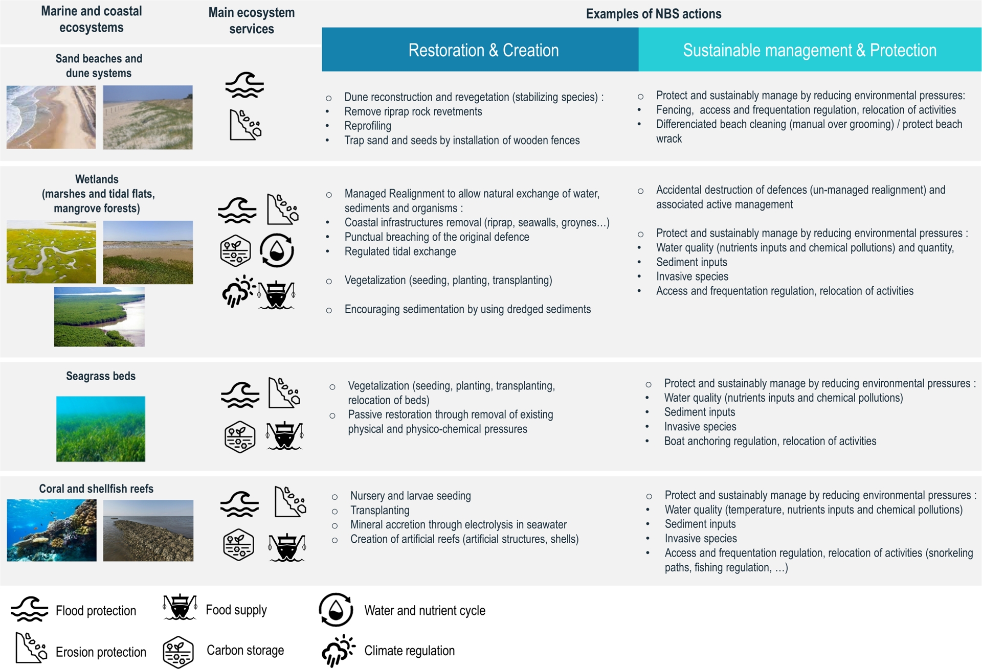 Examples of coastal Nature-Based Solutions (NBS) and their co-benefits for different types of coastal environments relevant to mainland France and overseas regions and territories. NBS refer to a range of established approaches (restoration, protection, ecosystem management) simultaneously providing societal and environmental co-benefits (Figure adapted from “Geochronique”, N°164, Société Géologique de France).