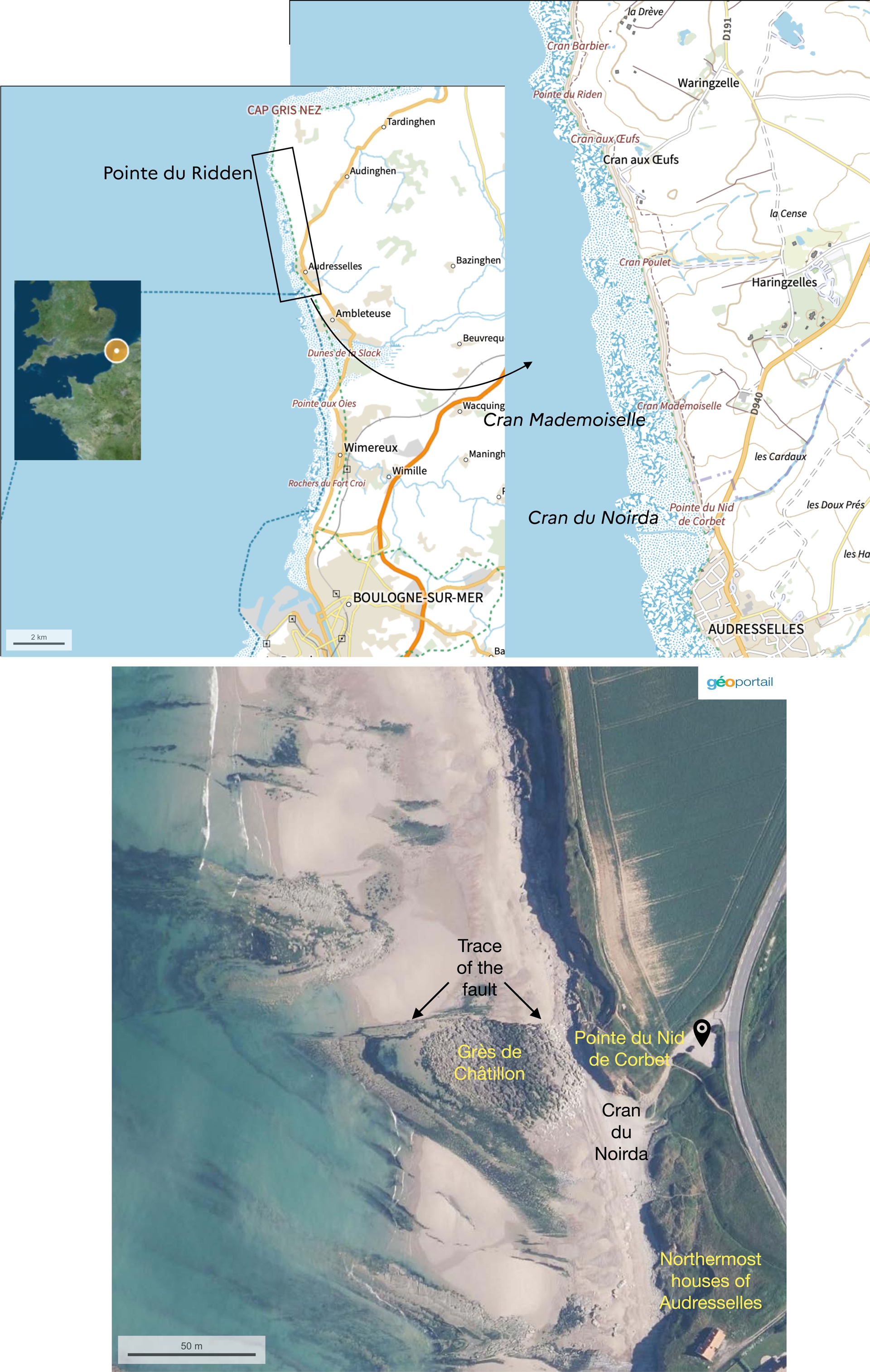 Location of the area studied here in the Boulonnais area. Maps and photograph from the Geoportail website of the French Institut Géographique National.