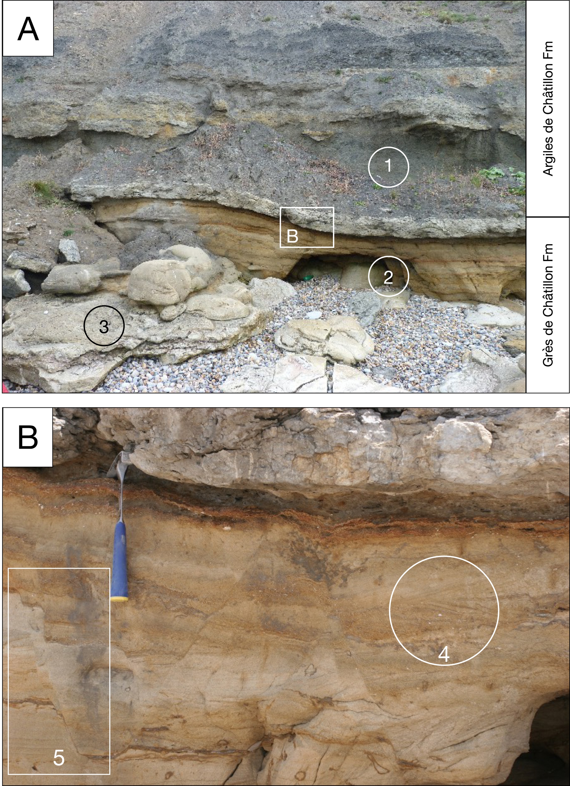 (A) Picture of the basal claystone level of the Argiles de Châtillon Fm. (1), overlying the top part of the Grès de Châtillon. This latter is almost not cemented except for rounded concretions (2 & 3). The whitish level separating the two formations is illustrated with the lower part of (B), together with the orange-color topmost level mentioned in the text, as well as herring bone-like structures (1) and synsedimentary fault (2).