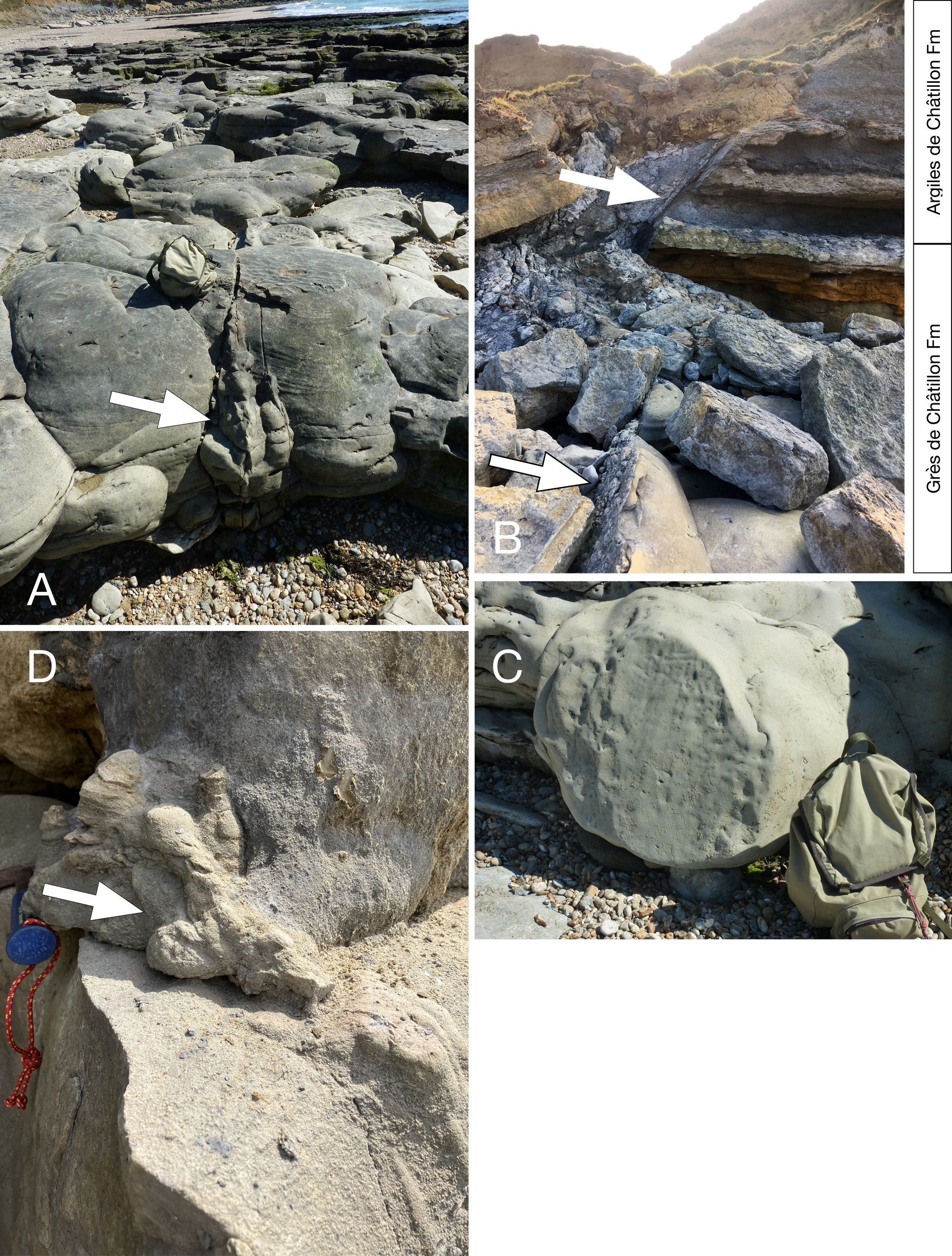Structures pictured at the Cran du Noirda (see Figure 1) accompanying the synsedimentary fault movement. (A) Indurated injectites visible on the cemented nodules. (B) The fault plane itself, also visible in Figure 1), affecting the transition zone between the Grès de Châtillon and Argiles de Châtillon formations. The fault cut some sandstone nodules (lower arrow in B, C). (D) A soft sand injective penetrating the Argile de Châtillon Fm.
