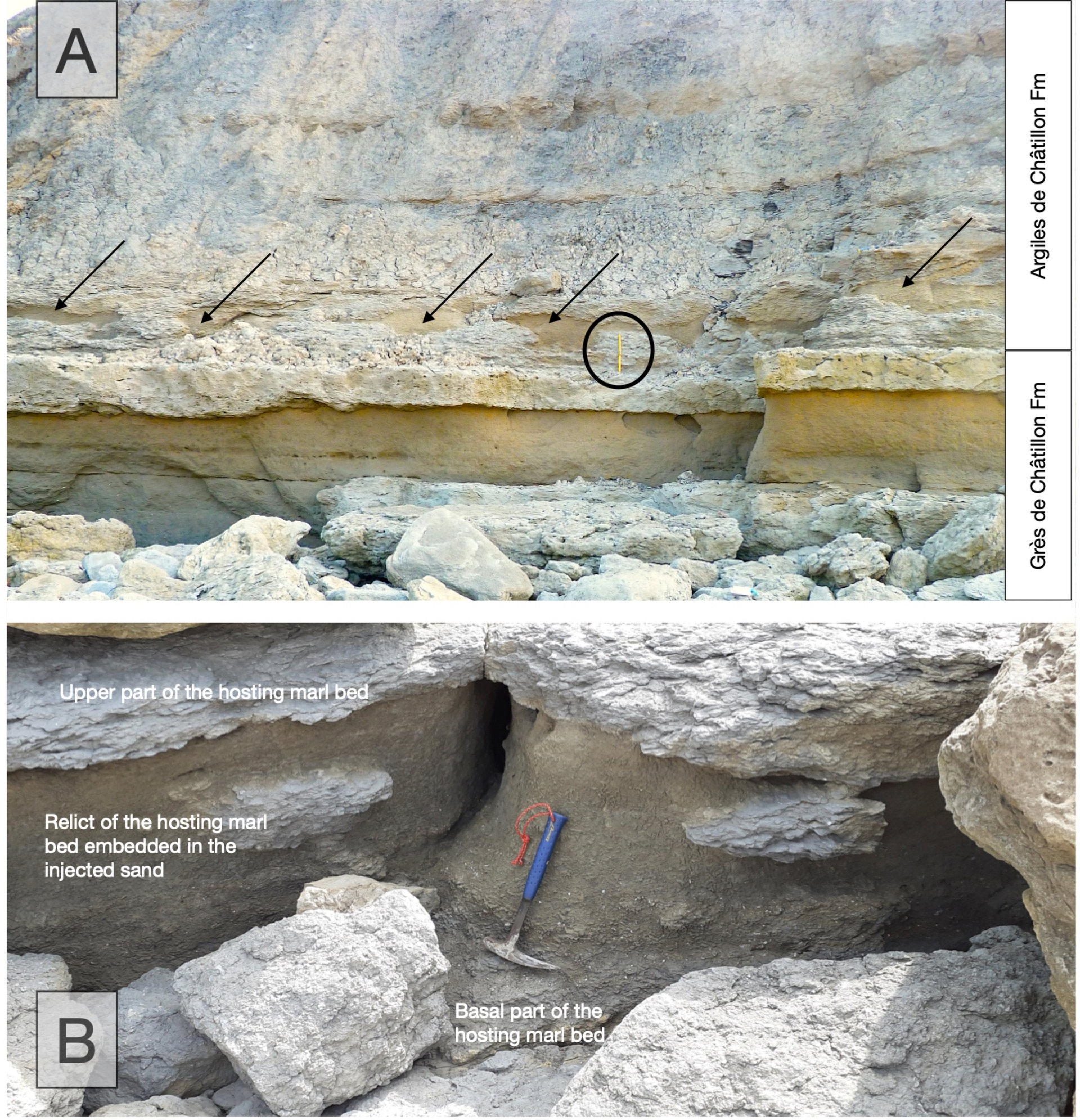 Sand injectites in the lower part of the Argiles de Châtillon Formation fueled by sand from the underlying Grès de Châtillon Formation. (A) The arrows point to unconsolidated sand lobes injected into the base of the Argiles de Châtillon Fm. Circle: a wooden folding meter for scale, on top of the whitish level separating the two formations. (B) Close up view of the sand injected into the basal marly bed of the Argiles de Châtillon Fm., with relicts of the marly beds embedded within the sand.
