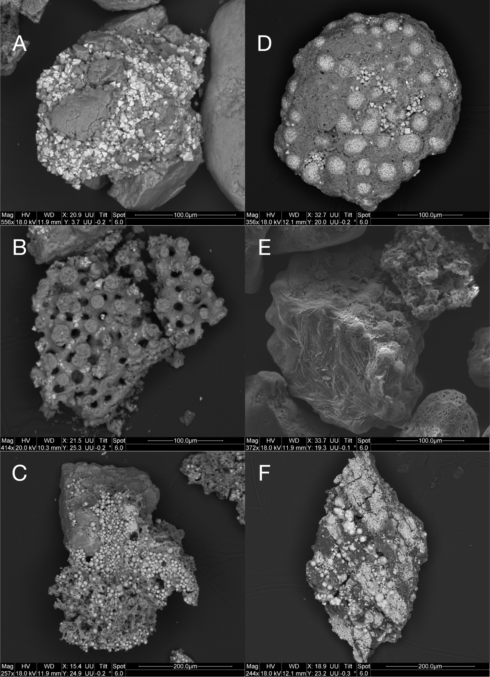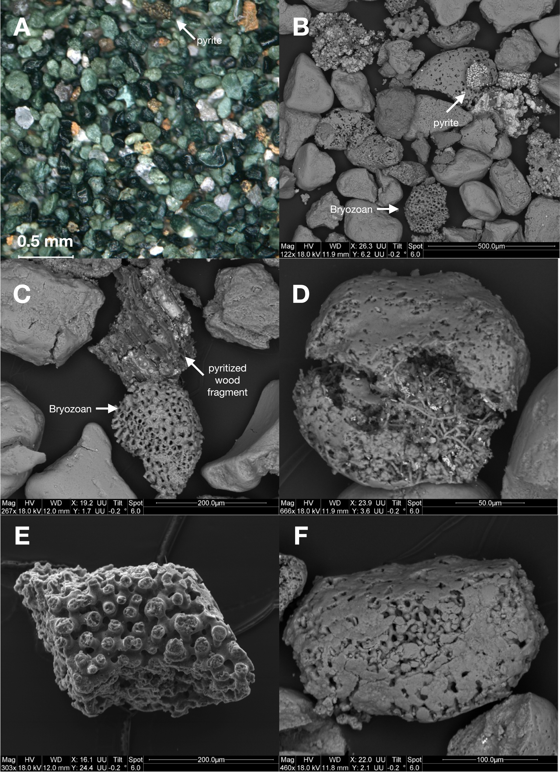 (A) A population of magnet-sensitive particles after magnetic separation, showing a relative wide array of green colors. Noteworthy, the presence of quartz grains and a pyrite polyframboid. (B, C) SEM images of the particles, with notably a pyritized wood fragment and a glauconitized bryozoan (C). (D) The peculiar grain with sort of endolithic filaments, looking like a microbial structure. (E, F) Glauconitized bryozoans. Sometimes, the grains are almost coated with glauconite (F). If complete, the coating would give the visual impression of a solid grain.