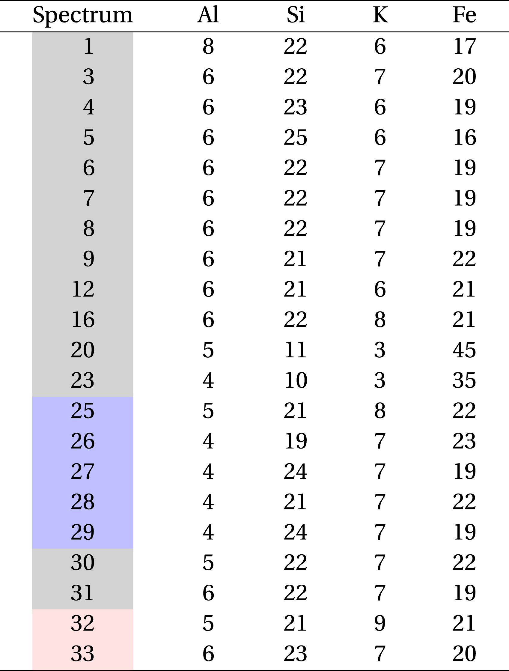 Chemical analyses (through EDS-equipped SEM) of glauconite particles, expressed in weight %