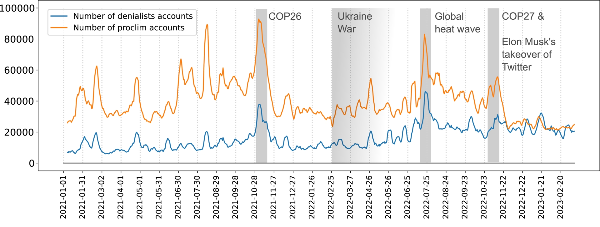 Worlwide evolution of number of estimated core pro-climate and climate denialists accounts on Twitter between 2021 and 2023. Data are averaged over a rolling week for better readability.