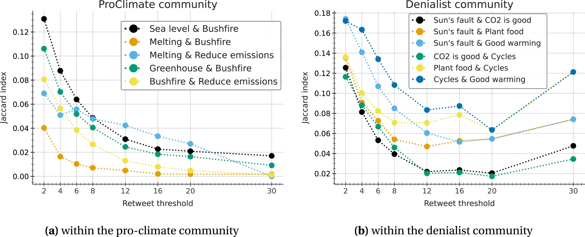 Jaccard index based on retweet threshold, calculated on online discussions that took place on Twitter in 2021. A high jaccard index for a high threshold means that the exact same accounts are tweeting or retweeting about the two topics with high volume (see Supplementary Material J).