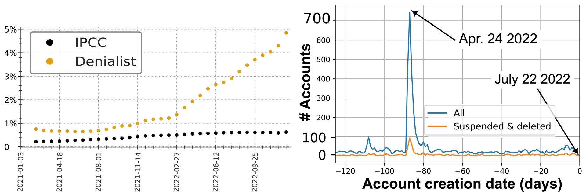 An example of the former is detailed in Supplementary Figure G.1. An example of the latter is provided by a detailed analysis of the climate denial wave of July 20, 2022. It gives insights into both the scale of these practices and the extent to which the proportion of fake accounts could be underestimated.