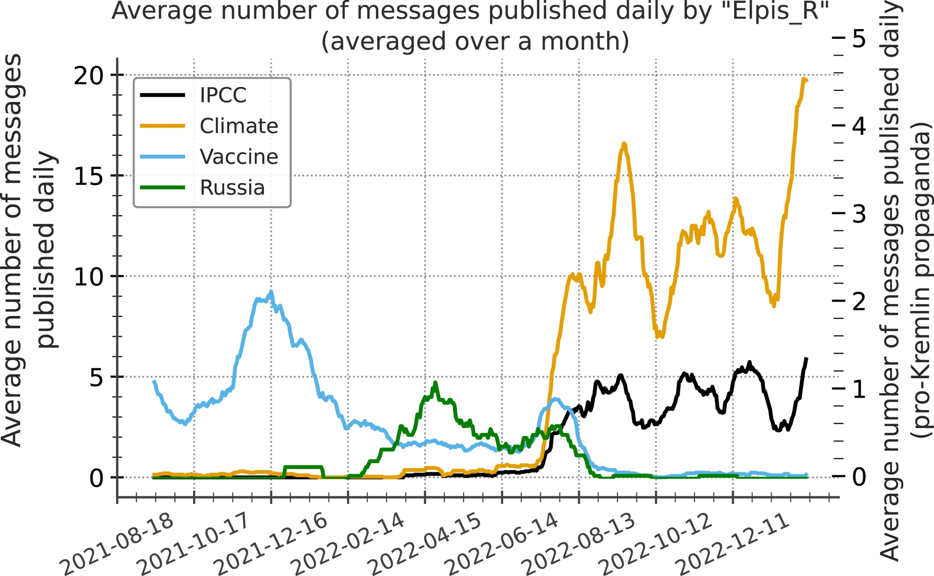 Daily number of messages from the account Elpis_R on some key topics. Warnings: the plot of messages relaying Kremlin propaganda has been drawn on another scale for questions of readability. All Elpis_R messages were retrieved using Twitter’s public API before it was shut down. Key words used to define the topics (originally in French): Climate—“CO2”, “warming”, “climate”; IPCC—IPCC, GIEC; Covid—“covid”, “vaccination”, “vaccine”; Russia—“Putin”, “russia”, “ukraine”, “Zelensky”.