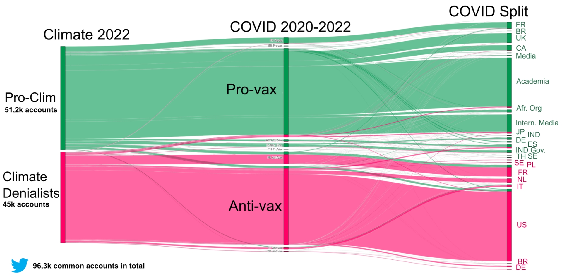 Although the conspirationist and confusionist approach to climate change has been active for years (Uscinski et al., 2017), we should not understate the particular context in which this trend is now unfolding. First, we are in a post-pandemic world that has witness an unprecedented growth in online anti-system and conspirationist theories. These theories have been favored by two years of fears and uncertainties engendered by the pandemic and the scale of the restrictive and often liberticide measures that had to be put in place by governments to contain it. This situation has provided fertile ground for the development of very powerful digital communities (Chavalarias, 2022), which are now being re-mobilized on the climate denialism front by leaders seeking to maintain an audience.