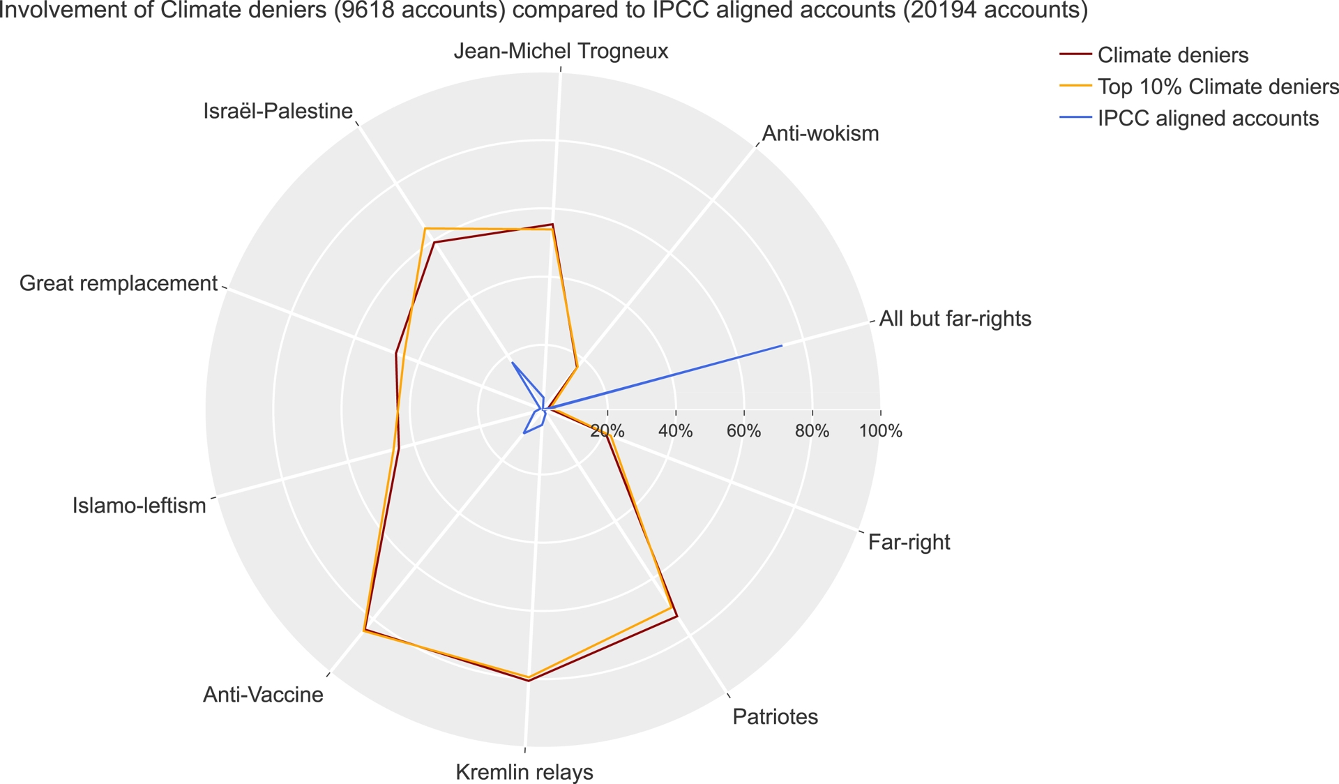 As it can be seen on Figure 8, the common characteristic of the core climate denialist community is that it invests opportunistically in divisive issues compared to the reference group of IPCC-aligned communities (20k accounts): 84.5% contributed to anti-vaccine propaganda (8.45 times more than the reference group), 59.4% to exchanges about the Israeli-Palestinian conflict (3.36 times more than the reference group), 47.1% to great replacement theory propaganda (25.9 times more than the reference group), 44.7% to the promotion of “islamo-leftism” concept (12.7 times more than the reference group), 17% to “anti-wokism” movement (36.7 times more than the reference group). 94% of core climate deniers are involved in far-right groups (see also Supplementary Figure D.5): 20.8% in the Rassemblement national or Reconquête! communities and 73.2% in the Patriotes (vs. 3.81% for the reference group). But what is most striking is their involvement as relays of Kremlin propaganda. More than 80% of them have relayed at least once some Kremlin narratives about NATO, the Ukraine war or President Zelensky, this estimation being a lower bound. In comparison, only 5.48% of the reference group had done so.